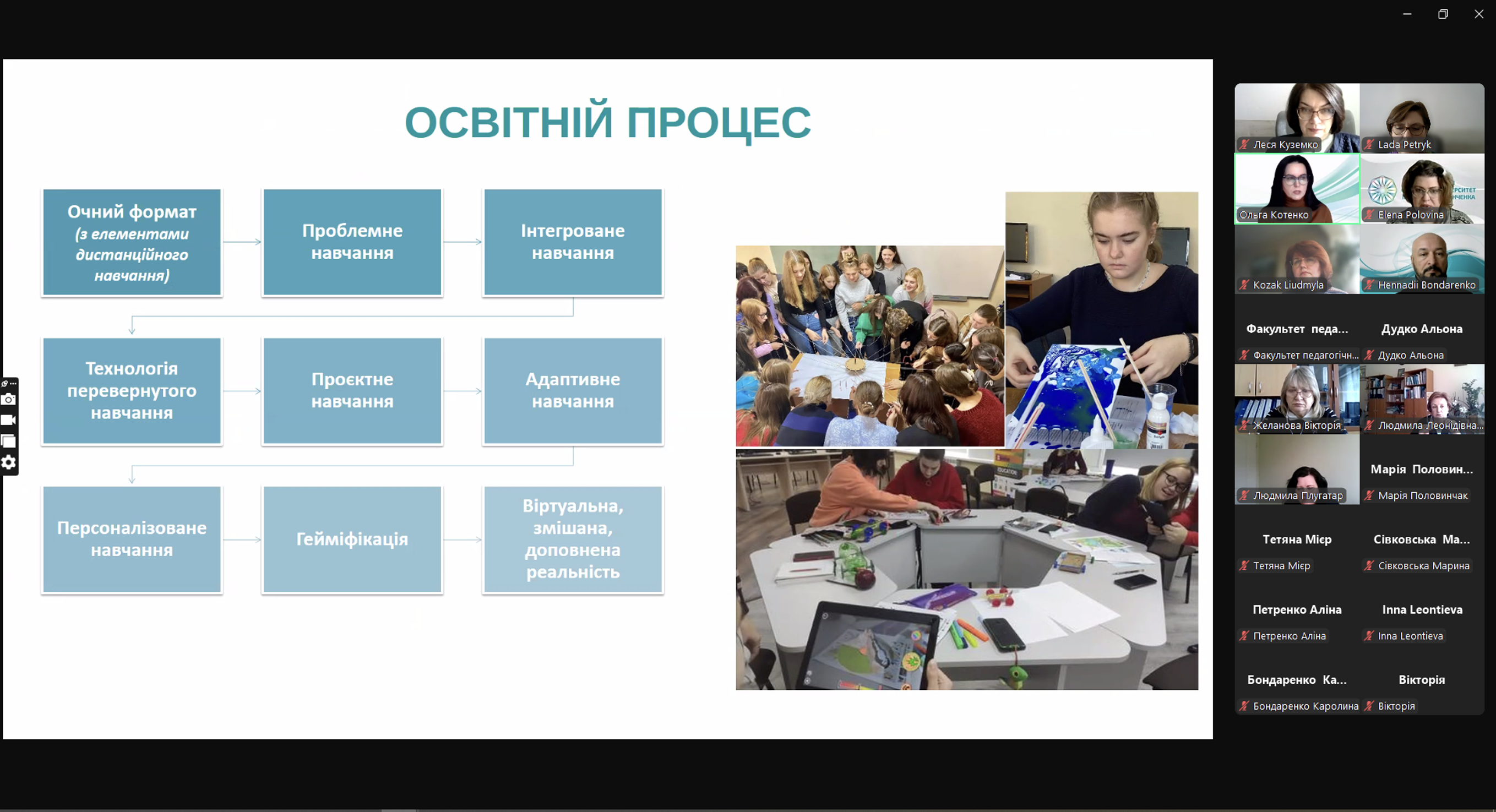 До профорієнтаційного заходу долучились завідувачі кафедр та гаранти освітньо-професійних програм. Олена ПОЛОВІНА, завідувач кафедри дошкільної освіти та Людмила КОЗАК, професор кафедри дошкільної освіти, презентували освітньо-професійні програми 1А2.00.01 Дошкільна освіта (перший (бакалаврський) освітній рівень) та 2А2.00.01 Дошкільна освіта (другий (магістерський) освітній рівень); Геннадій БОНДАРЕНКО, завідувач кафедри початкової освіти та Тетяна МІЄР, професор кафедри початкової освіти, презентували освітньо-професійні програми 1А3.00.01 Початкова освіта (перший (бакалаврський) освітній рівень) та 2А3.00.01 Початкова освіта (другий (магістерський) освітній рівень); Людмила ХОРУЖА, завідувач кафедри освітології та психолого-педагогічних наук, розповіла про особливості навчання на освітньо-професійних програмах 2А1.00.01 Корпоративна освіта та розвиток персоналу (другий (магістерський) освітній рівень) та 2А1.00.02 Освітній дизайн і коучинг в освіті дорослих (другий (магістерський) освітній рівень).