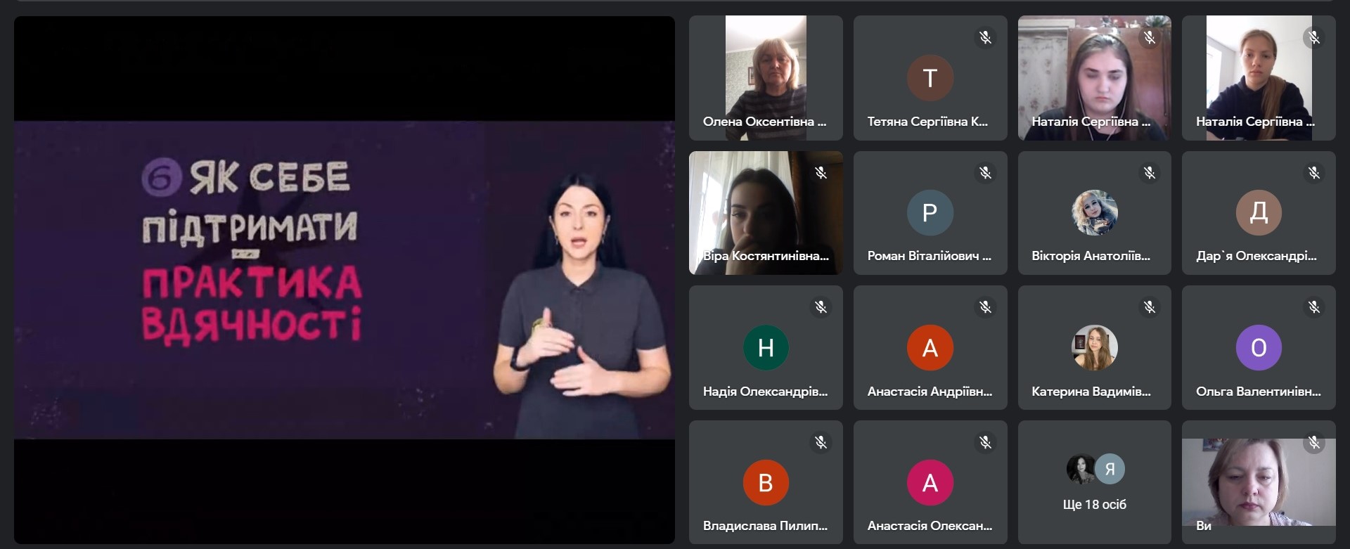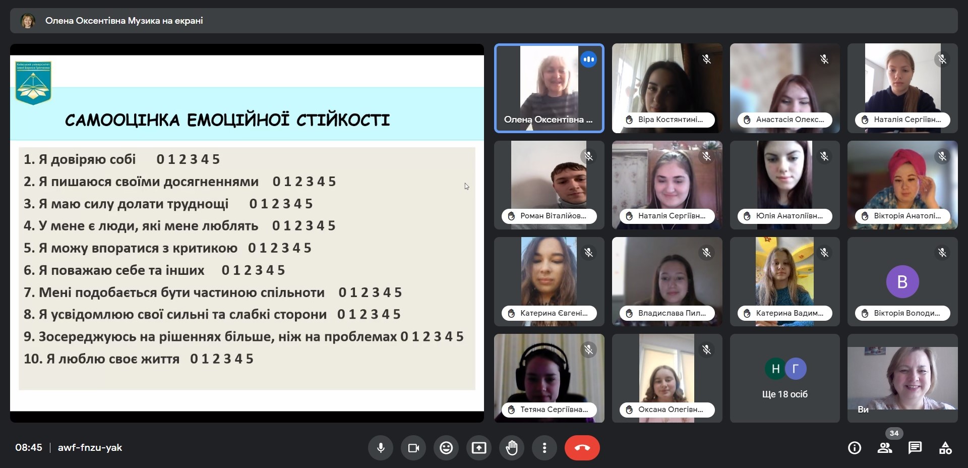 Зацікавленість аудиторії викликали техніки і вправи, що допомагають залишатися в ресурсі, повертають людину в площину її цінностей. Учасники й учасниці тренінгу вправлялися «відчіплюватися з гачка» тривожних думок і почуттів, «заземлятися», перенаправляти увагу, включатися в діяльність і діяти згідно з власними цінностями. У ході обговорення студенти висловлювали думки про важливість отриманих знань і вмінь у житті та професійній діяльності.