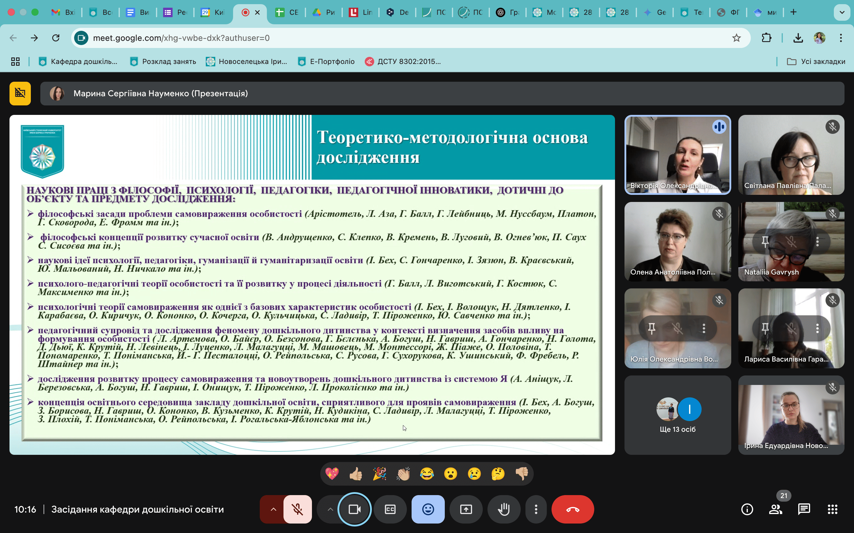 29 квітня 2025 року відбулось розширене засідання кафедри дошкільної освіти Факультету педагогічної освіти. На порядку денному – публічна презентація наукових результатів дисертації В’юнник Вікторії Олександрівни на тему «Самовираження дітей п’ятого року життя в освітньому середовищі закладів дошкільної освіти», поданої на здобуття ступеня доктора філософії з галузі знань 01 Освіта/Педагогіка за спеціальністю 012 Дошкільна освіта, та її обговорення для надання висновку про наукову новизну, теоретичне та практичне значення результатів дисертації. Науковий керівник – Половіна О. А., завідувач кафедри дошкільної освіти Факультету педагогічної освіти Київського столичного університету імені Бориса Грінченка, кандидат педагогічних наук, доцент.
