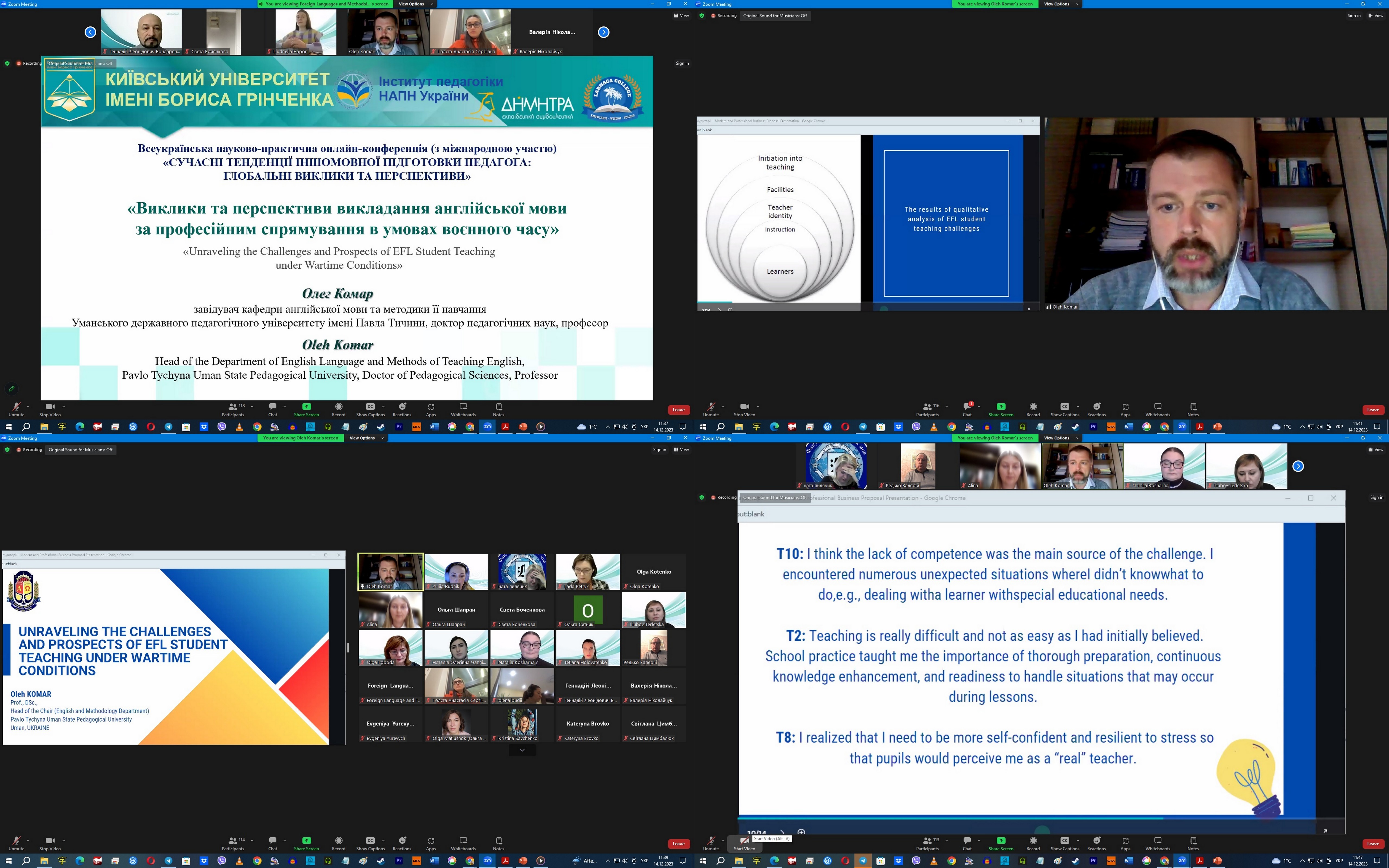 Учасники мали можливість ознайомитись із науковими доробками Ольги ШАПРАН, завідувача кафедри освітології та педагогічної інноватики Університету Григорія Сковороди в Переяславі, доктора педагогічних наук, професора (“Тенденції розвитку іншомовної педагогічної освіти в Україні: сучасні виклики, інновації та перспективи”); Наталії ПИЛЯЧИК, доцента кафедри англійської філології факультету іноземних мов Прикарпатського національного університету імені Василя Стефаника, кандидата філологічних наук, доцента (“Глобальні трансформації у сфері мовної освіти: активні стратегії, виклики та перспективи”); Валерія РЕДЬКА, завідувача відділу навчання іноземних мов Інституту педагогіки НАПН України, доктора педагогічних наук, старшого наукового співробітника (“Тенденції розвитку сучасної шкільної іншомовної освіти”); Олега КОМАРА, завідувача кафедри англійської мови та методики її навчання Уманського державного педагогічного університету імені Павла Тичини, доктора педагогічних наук, професора (“Виклики та перспективи викладання англійської мови за професійним спрямуванням в умовах воєнного часу”).