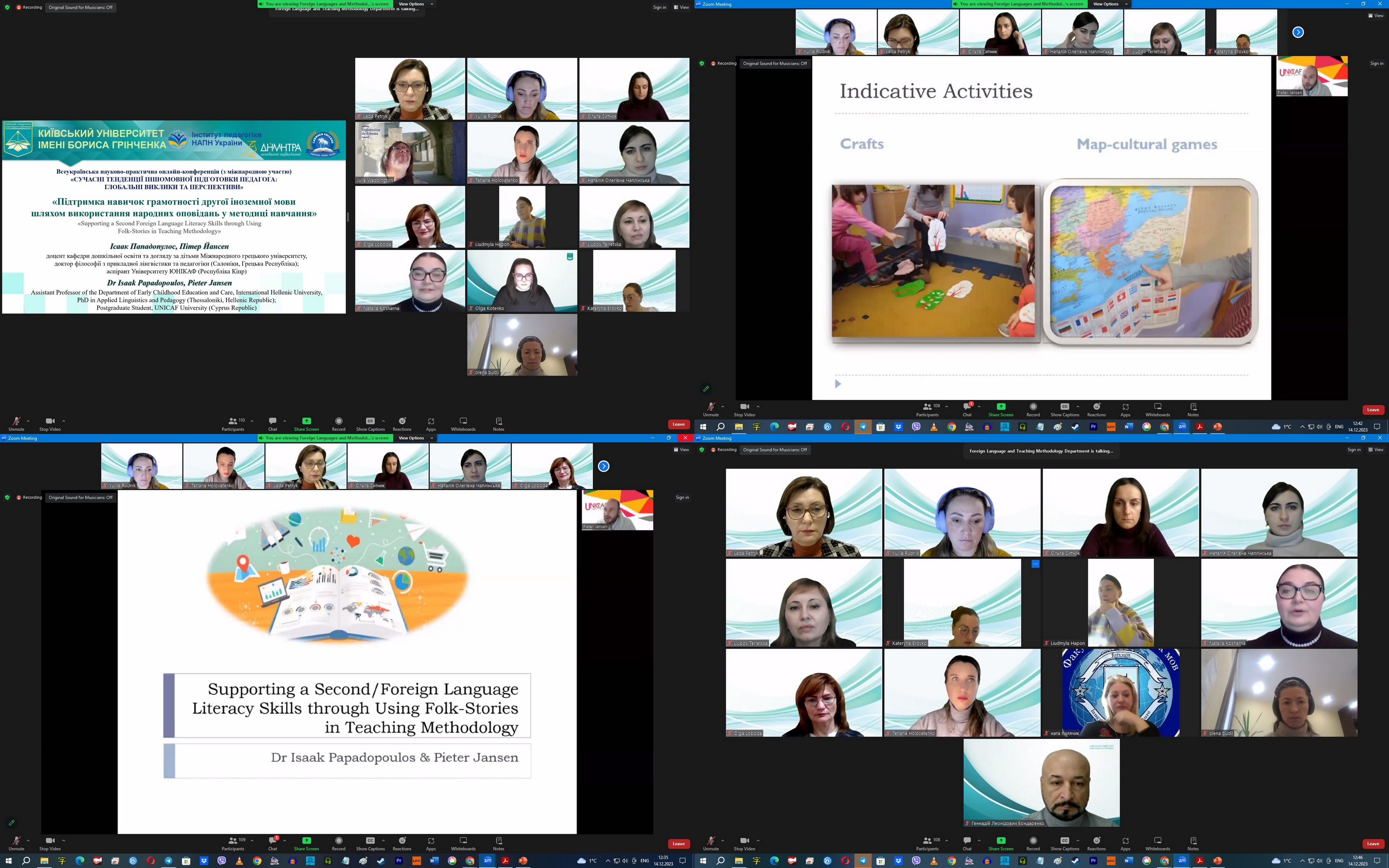 Також були представлені доповіді зарубіжних гостей: викладача мови та літератури факультету освіти і психології Університету Херони (Каталонія, Королівство Іспанія), доктора філософії з англійської літератури та критичної теорії Джулії ВАДІНГТОН (“Формування конструктивного ставлення до навчання іноземних мов у загальній педагогічній підготовці”) та доцента кафедри дошкільної освіти та догляду за дітьми Міжнародного грецького університету, доктора філософії з прикладної лінгвістики та педагогіки (Салоніки, Грецька Республіка) Ісаака ПАПАДОПУЛОСА з аспірантом Університету ЮНІКАФ (Республіка Кіпр) Пітером ЙАНСЕНОМ, які поділилися досвідом методики навчання іноземної мови (“Методичний супровід формування навичок грамотності у вивченні другої іноземної мови шляхом використання народних оповідань”).