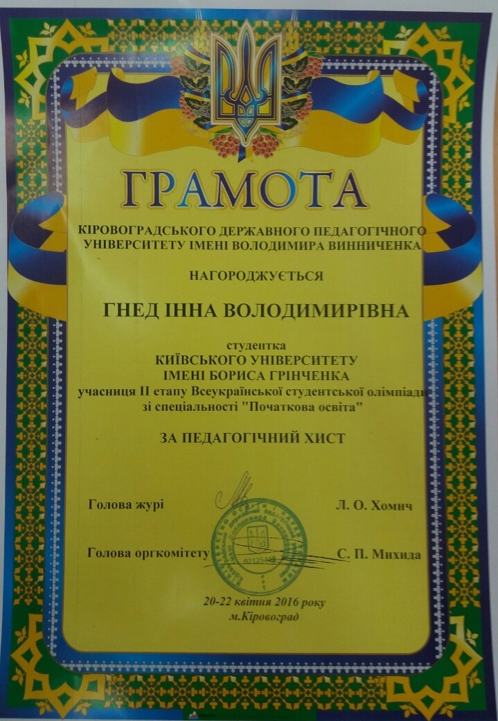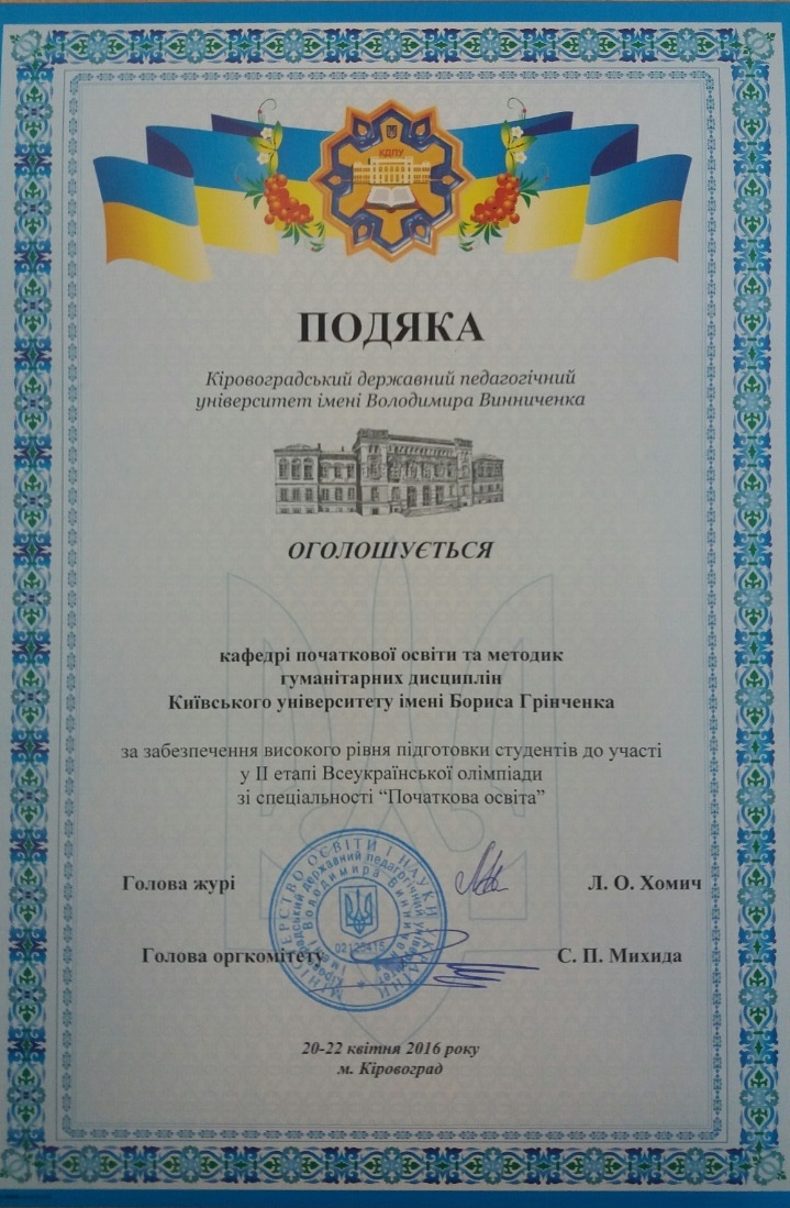 З 20 по 22 квітня 2016 року студентки-магістрантки спеціальності «Початкова освіта» Гнед І.В. та Власик Н.В. взяли участь у Всеукраїнській студентській олімпіаді зі спеціальності «Початкова освіта» у Кіровоградському державному педагогічному університеті імені Володимира Винниченка.