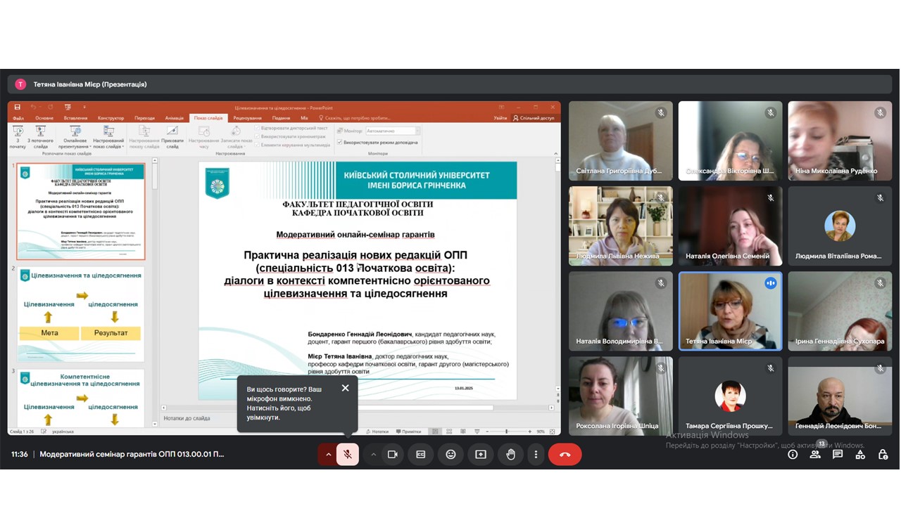 13 січня 2025 року для професорсько-викладацького складу кафедри початкової освіти Факультету педагогічної освіти Київського столичного університету імені Бориса Грінченка з метою обговорення результатів практичної реалізації нових редакцій ОПП в першому півріччі 2024-2025 н.р. та визначення напрямів подальшого удосконалення змісту робочих програм навчальних дисциплін, відповідно до яких здійснюється навчання на першому (бакалаврському) та другому (магістерському) рівнях здобуття вищої освіти за спеціальністю 013 Початкова освіта, було проведено модеративний семінар гарантів «Практична реалізація нових редакцій ОПП 013.00.01 Початкова освіта: діалоги в контексті компетентнісно орієнтованого цілевизначення та ціледосягнення».