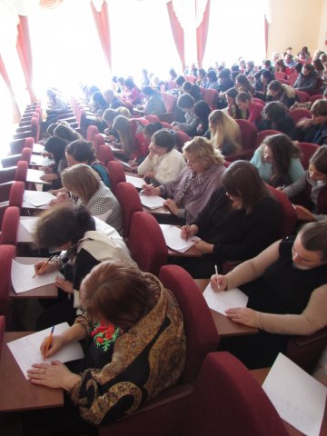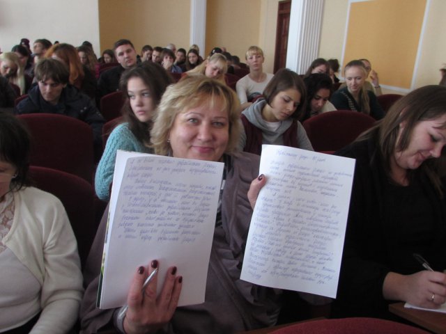 Усі учасники з хвилюванням та творчим піднесенням заздалегідь зібрались в актовій залі. Уважно слухаючи ефір, були подумки з колегами та друзями, які встановлювали рекорд України в номінації «Наймасовіше написання Диктанту національної єдності» у найбільшій залі нашого Університету.