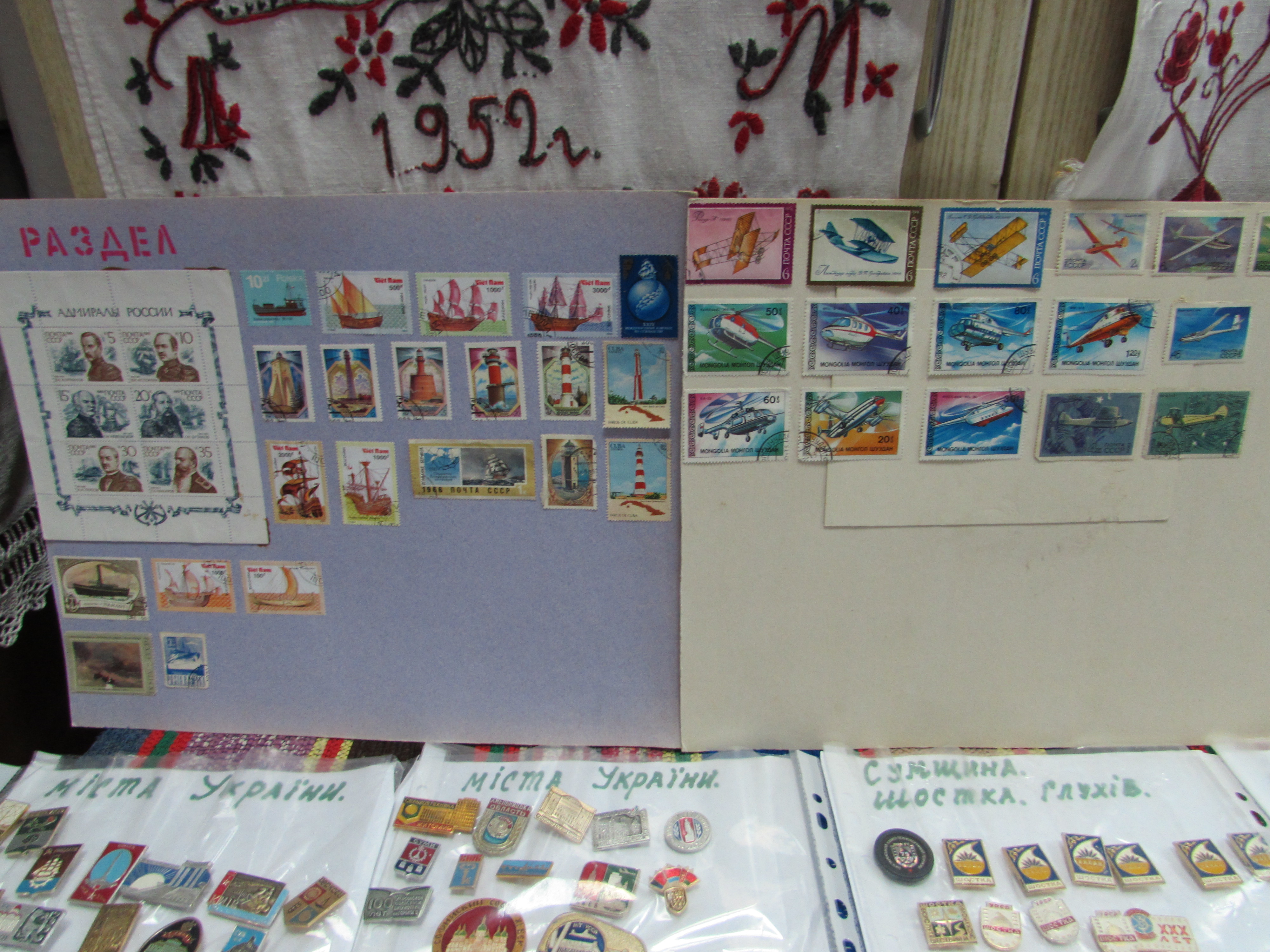 Відвідувачам виставки представлені значки, марки та поштові картки за розділами: «Міста», «Мистецтво», «Культура», «Досягнення науки і техніки», «Кораблі», «Автомобілі», «Літаки», «Спорт», «Рослинний світ», «Тваринний світ» та інші.