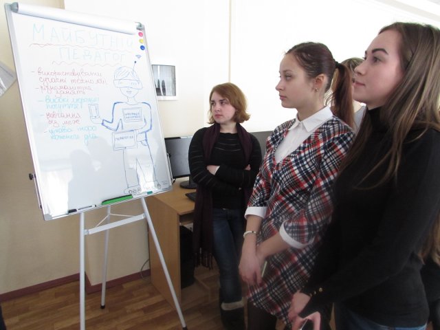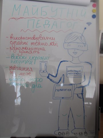 Наступне про що говорили студенти – якості педагога. Більшість особистих і професійних рис справжнього педагога залишилися непорушними в усі часи: розум, вихованість, відповідальність, охайність. Однак до якостей сучасного та майбутнього педагога додалися життєрадісність, почуття гумору, відкритість, здатність бути творчою особистістю та лідером. Також педагог «майбутнього» був змальований у футуристичному образі (вільний wi-fi, окуляри віртуальної реальності та функції googlе). Таке зображення-метафора відображало освіченого у всіх тонкощах науки, всебічно розвиненого педагога.