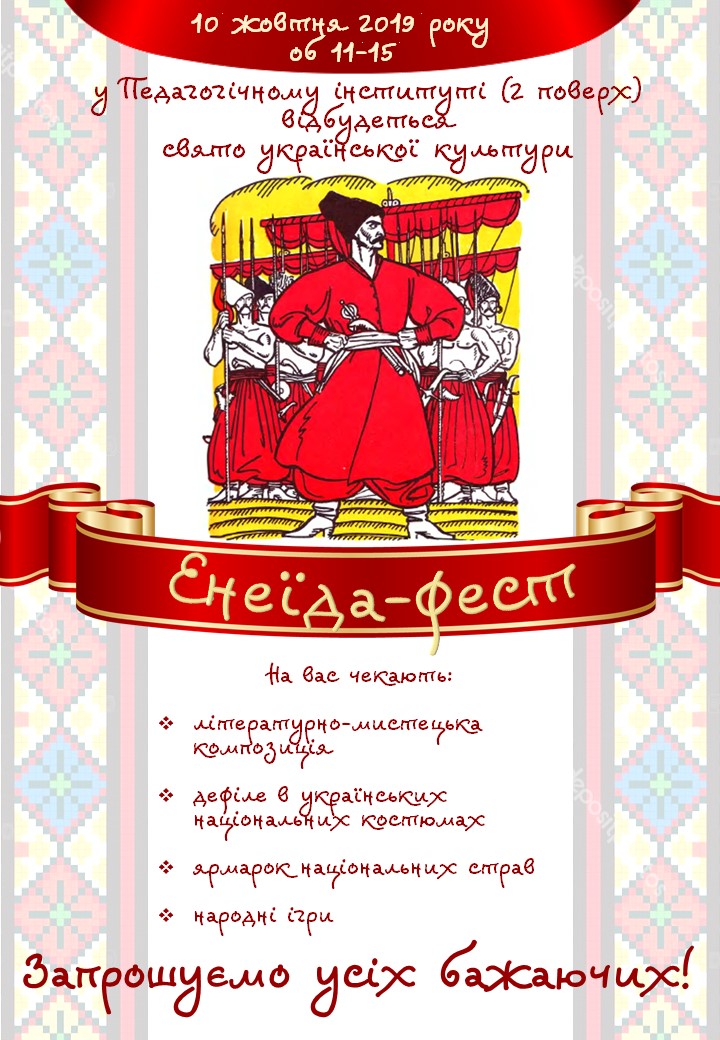 10 жовтня 2019 року у Педагогічному інституті відбулося свято «Енеїда»-фест, активними учасниками якого стали студенти спеціальностей «Початкова освіта» та «Дошкільна освіта»: ПОб-1-18-4.0д, ПОб-2-18-4.0д, ПОб-1-19-2.0д, ПОб-2-19-2.0д, ДОб-1-18-4.0д, ДОб-2-16-4.0д.