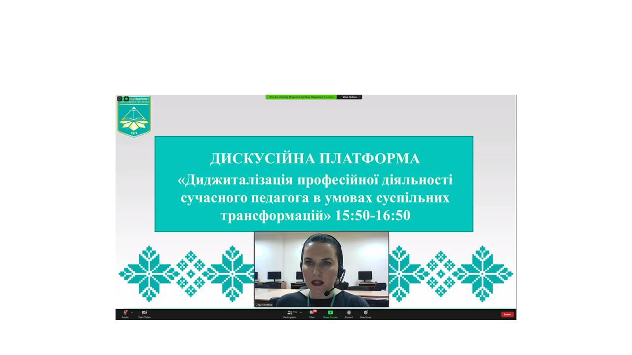 У ході дискусійної платформи «Диджиталізація професійної діяльності сучасного педагога в умовах суспільних трансформацій» тривали обговорення онлайн-доповідей спікерів конференції: Наталії Морзе, професора кафедри комп’ютерних наук і математики факультету інформаційних технологій та управління Київського університету імені Бориса Грінченка, доктора педагогічних наук, професора, член-кореспондента НАПН України на тему «Цифрова компетентність вчителя: міф чи реальність?»; Любові Найдьонової, заступника директора з наукової роботи ІСПП НАПН України, президента ГО «Українська асоціація медіапсихологів і медіапедагогів», доктора психологічних наук, професора, член-кореспондента НАПН України на тему «Кіберсоціалізація підлітків в умовах складнокоординованості світу: практичні поради вчителю»; Яни Фруктової, доцента кафедри журналістики та нових медіа Київського університету імені Бориса Грінченка, кандидата педагогічних наук, доцента на тему «Медіа-інформаційна компетентність сучасного вчителя: європейські практики, українські реалії»; Людмили Назаренко, доцента кафедри теорії й методики мовно-літературної та художньо-естетичної освіти Миколаївського обласного інституту післядипломної педагогічної освіти, кандидата педагогічних наук на тему «Віртуалізація у перспективному впровадженні ІКТ нового покоління в практику роботи вчителя-словесника».