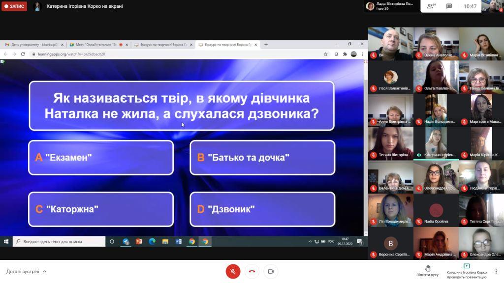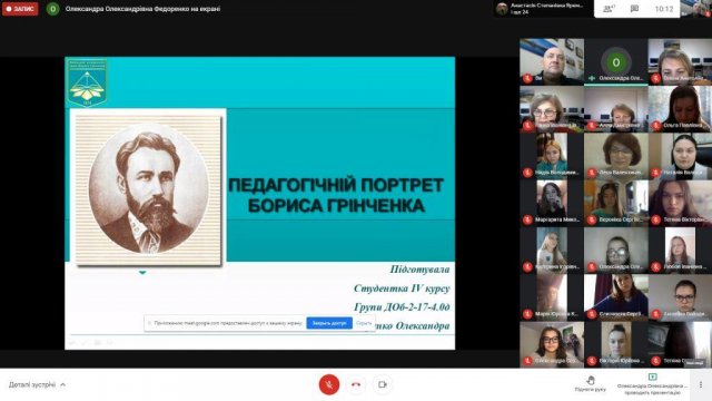 9 грудня 2020 року з нагоди відзначення Дня Університету за ініціативи співробітників кафедри педагогіки та психології Педагогічного інституту проведено онлайн-вітальню «Борис Грінченко: діалог із сучасністю», за участі студентів 1, 3 та 4 курсів спеціальності «Дошкільна освіта». Учасники історико-педагогічних студій презентували результати власних наукових пошуків педагогічної спадщини Бориса Грінченка.