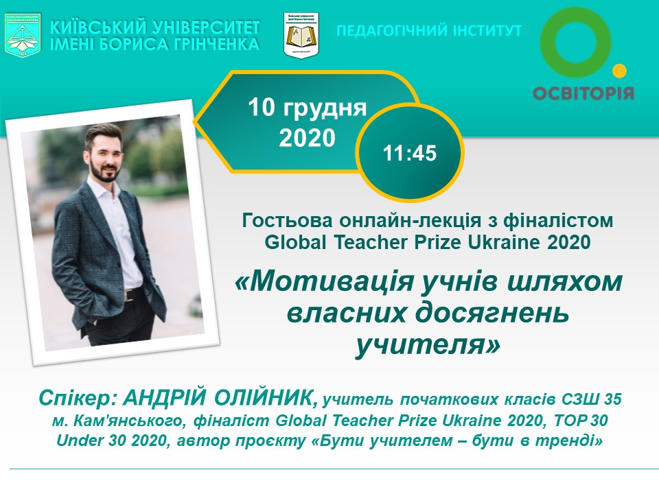 10 грудня 2020 року у межах співпраці Педагогічного інституту Київського університету імені Бориса Грінченка з Громадською спілкою «Освіторія» відбулася гостьова онлайн-лекція для студентів спеціальності «Початкова освіта» з учителем початкових класів СЗШ №35 м. Кам'янського, фіналістом Global Teacher Prize Ukraine 2020, TOP 30 Under 30 2020, автором проєкту «Бути учителем – бути в тренді» Андрієм Олійником із теми «Мотивація учнів шляхом власних досягнень учителя».