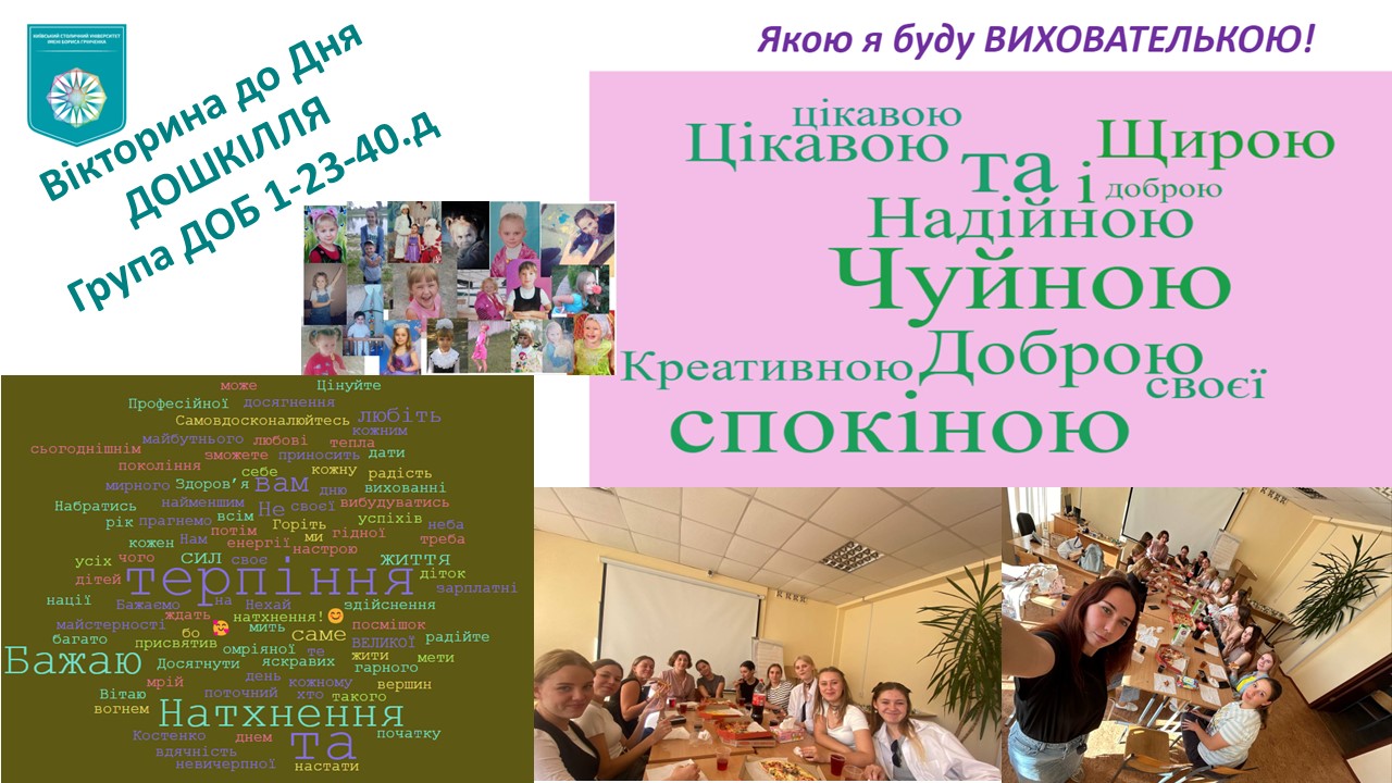 Куратор Олена Літіченко підготувала для студентів своєї академічної групи вікторину з нагоди відзначення Дня дошкілля. Студенти пригадали цікаві факти з власного дитинства, більше дізнались про сучасних вихователів, виконали завдання пов’язані з майбутньою діяльністю. Поринувши у світ дитинства, учасники вікторини замріяли себе у професії, склали свій власний портрет майбутнього вихователя.