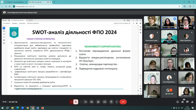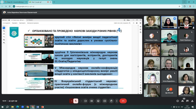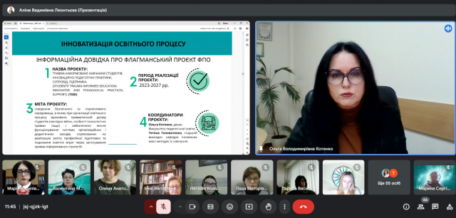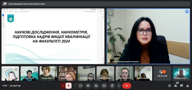Ольга Володимирівна Котенко, декан, кандидат педагогічних наук, доцент, оприлюднила Звіт про діяльність Факультету за 2024 рік. Свою оцінку щодо звіту про діяльність Факультету за 2024 рік висловили Бондаренко Геннадій Леонідович, кандидат педагогічних наук, доцент, завідувач кафедри початкової освіти; Козак Людмила Василівна, доктор педагогічних наук, професор кафедри дошкільної освіти; Кошарна Наталія Володимирівна, кандидат педагогічних наук, доцент, завідувач кафедри іноземних мов і методик їх навчання; Половіна Олена Анатоліївна, кандидат педагогічних наук, доцент, завідувач кафедри дошкільної освіти; Леонтьєва Інна Василівна, кандидат педагогічних наук, доцент кафедри освітології та психолого-педагогічних наук; Губарєва Ксенія Олегівна, студентка ІІ курсу спеціальності 013 Початкова освіта.