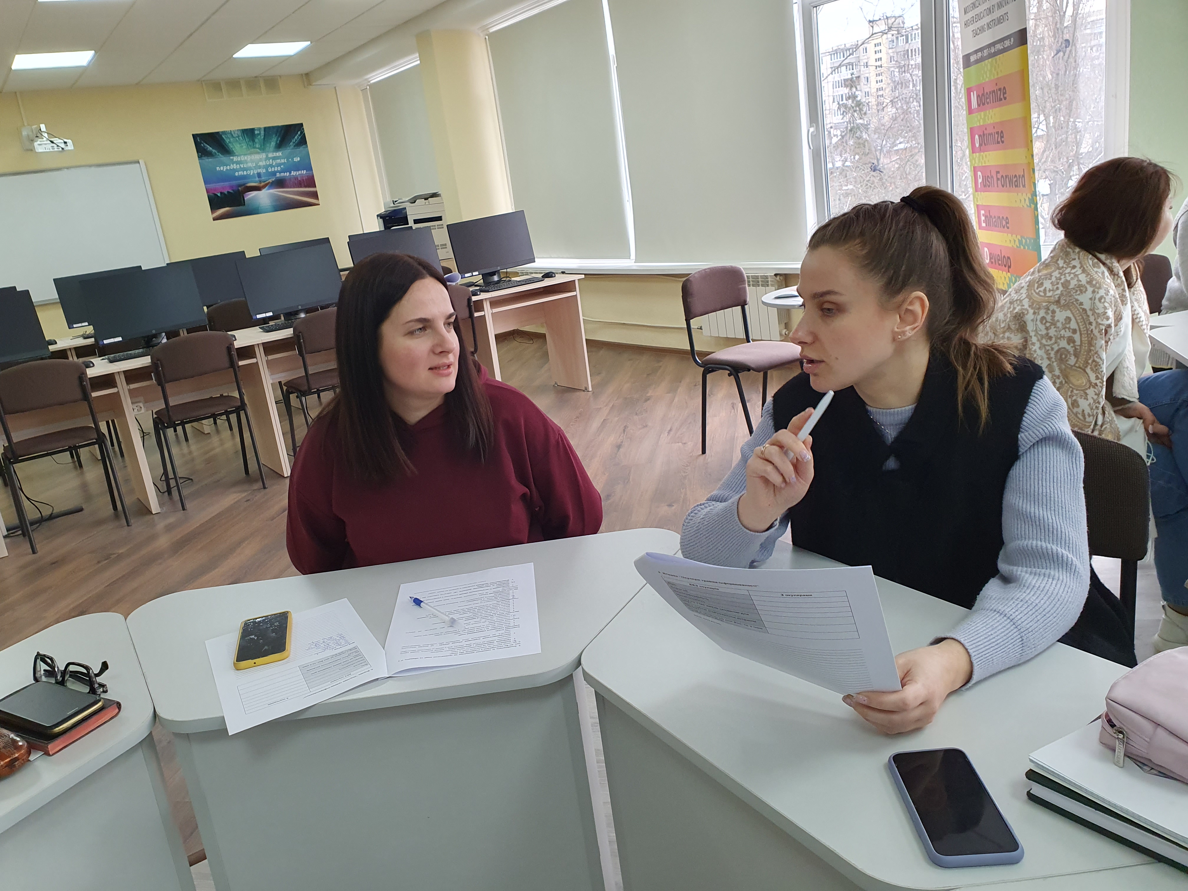 Модератори тренінгових сесій: Ольга Котенко, декан Факультету педагогічної освіти, кандидат педагогічних наук, доцент; Тетяна Головатенко, старший викладач кафедри іноземних мов і методик їх навчання, доктор філософії (галузь знань 01 Освіта/Педагогіка)