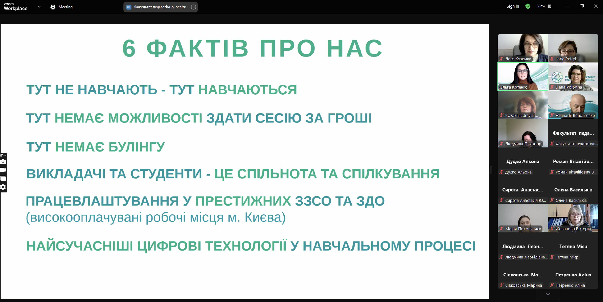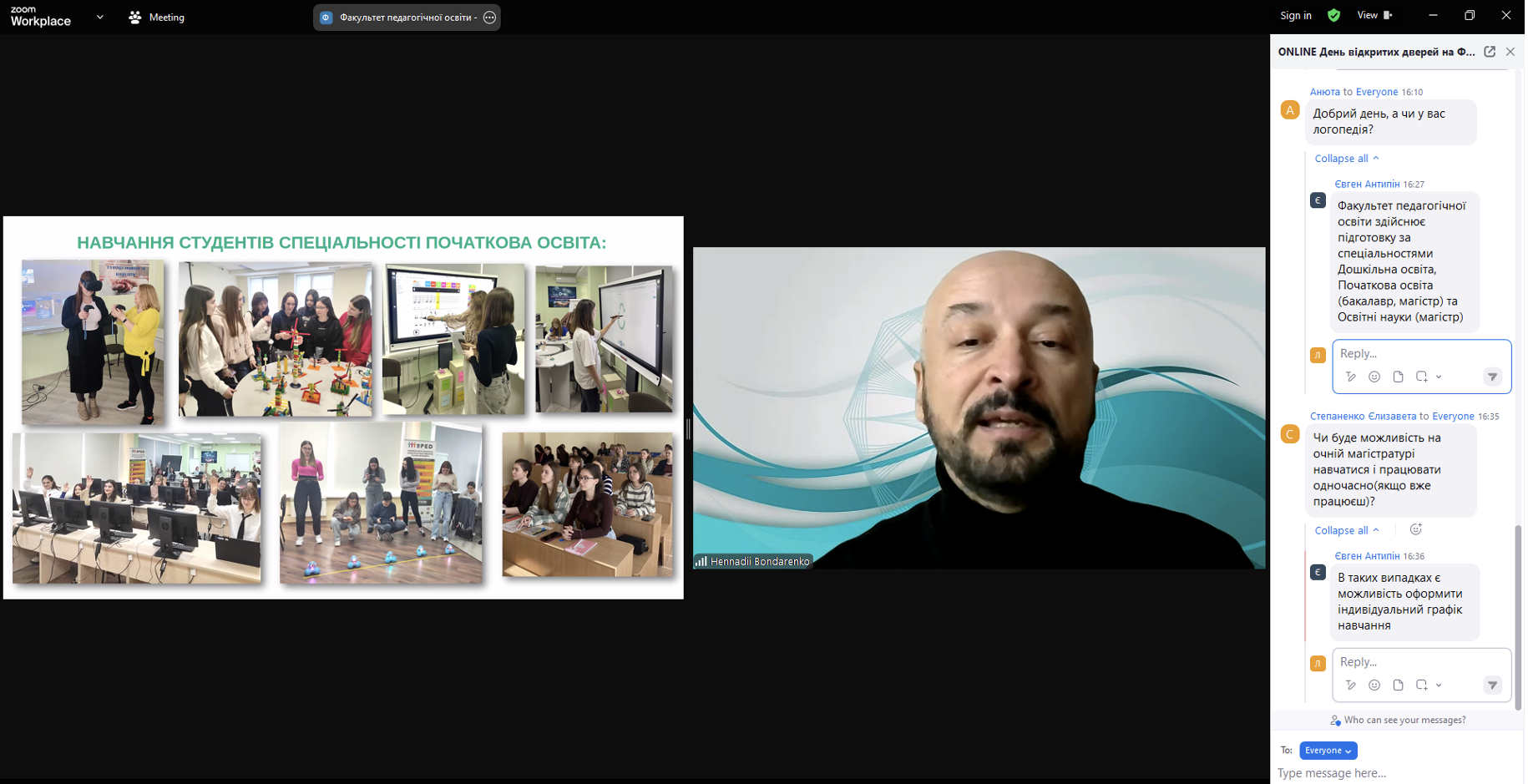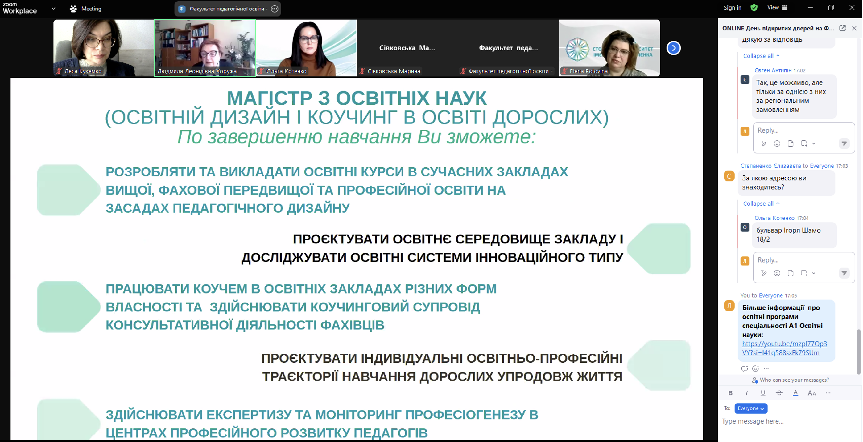 До профорієнтаційного заходу долучились завідувачі кафедр та гаранти освітньо-професійних програм. Олена ПОЛОВІНА, завідувач кафедри дошкільної освіти та Людмила КОЗАК, професор кафедри дошкільної освіти, презентували освітньо-професійні програми 1А2.00.01 Дошкільна освіта (перший (бакалаврський) освітній рівень) та 2А2.00.01 Дошкільна освіта (другий (магістерський) освітній рівень); Геннадій БОНДАРЕНКО, завідувач кафедри початкової освіти та Тетяна МІЄР, професор кафедри початкової освіти, презентували освітньо-професійні програми 1А3.00.01 Початкова освіта (перший (бакалаврський) освітній рівень) та 2А3.00.01 Початкова освіта (другий (магістерський) освітній рівень); Людмила ХОРУЖА, завідувач кафедри освітології та психолого-педагогічних наук, розповіла про особливості навчання на освітньо-професійних програмах 2А1.00.01 Корпоративна освіта та розвиток персоналу (другий (магістерський) освітній рівень) та 2А1.00.02 Освітній дизайн і коучинг в освіті дорослих (другий (магістерський) освітній рівень).
