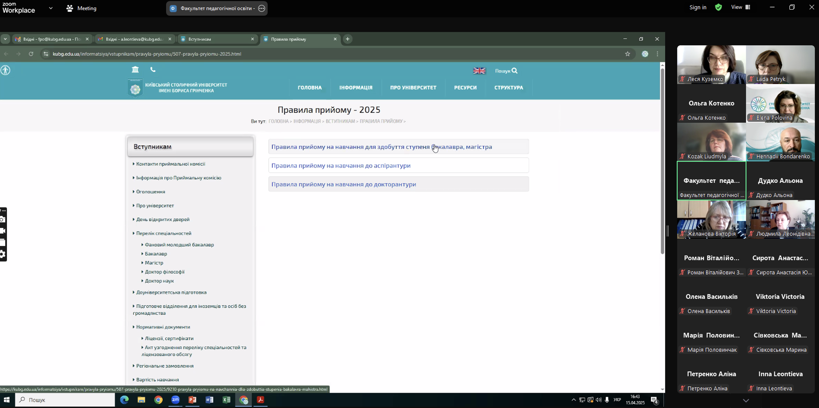 15 квітня 2025 року на Факультеті педагогічної освіти організовано та проведено ONLINE День відкритих дверей. На захід завітали понад 120 майбутніх абітурієнтів, що цікавились бакалаврськими та магістерськими програмами Факультету. Ольга КОТЕНКО, декан Факультету педагогічної освіти та Леся КУЗЕМКО, заступник декана з науково-методичної та навчальної роботи, ознайомили гостей з перевагами вступу на Факультет педагогічної освіти, особливостями організації освітнього процесу, умовами вступу на бакалаврський та магістерський рівні вищої освіти, а також продемонстрували календар вступника 2025, в якому зібрані найважливіші дати початку та завершення Вступної кампанії 2025 року.