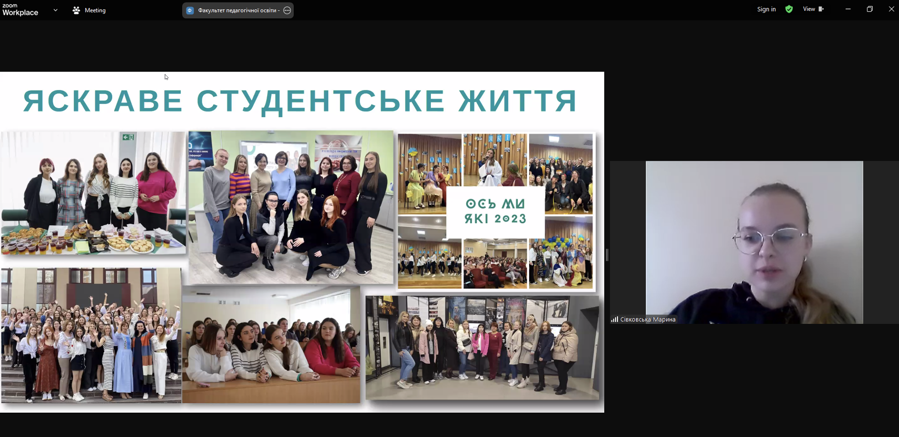 Марина НАУМЕНКО, викладач кафедри дошкільної освіти, презентувала “Абітурієнтський гайд”, у перебігу якого учасники заходу мали змогу, в режимі онлайн, відвідати рубрику “Вступникам” на вебпорталі Факультету та побачити, як знайти необхідну інформацію та контакти для звернень у разі виникнення запитань. Про яскраве студентське життя розповіла Марина СІВКОВСЬКА, голова інформаційного департаменту Ради студентського самоврядування Факультету.