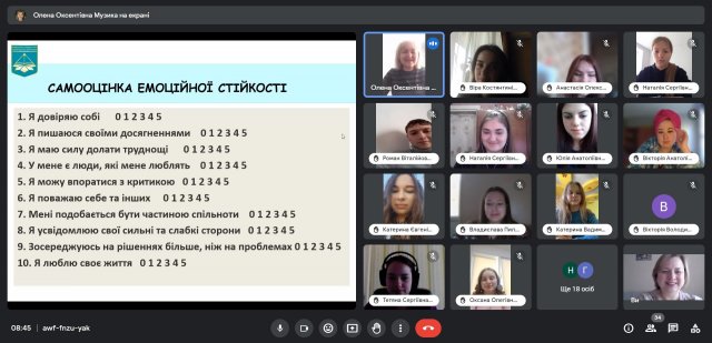 Упродовж тренінгу першокурсники поглиблювали знання про емоційну стійкість, відшукували ресурси для її розвитку, навчалися підтримувати себе та інших. Продуктивною була робота з аналізу складних життєвих ситуацій, самооцінювання власної емоційної стійкості та створення психологічного портрету емоційно стійкої людини.