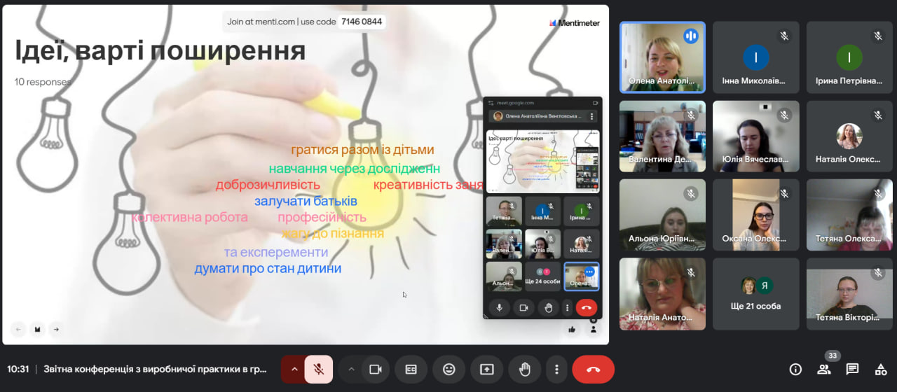 Завершилася зустріч тим, що кожен учасник визначив власну перемогу, якої досяг під час І етапу виробничої (безвідривної) практики («Маленькі перемоги дітей, це і мої перемоги», «Моя найбільша перемога це те, що я дуже швидко знаходила контакт з кожною дитиною», «Проведення перфоманс-гри», «Задоволення від спілкування і співпраці з дітьми раннього віку», «Моя найбільша перемога: у дистанційному форматі, я змогла виконати завдання, навіть у команді», «Зберігати емоційний баланс під час тривоги»).