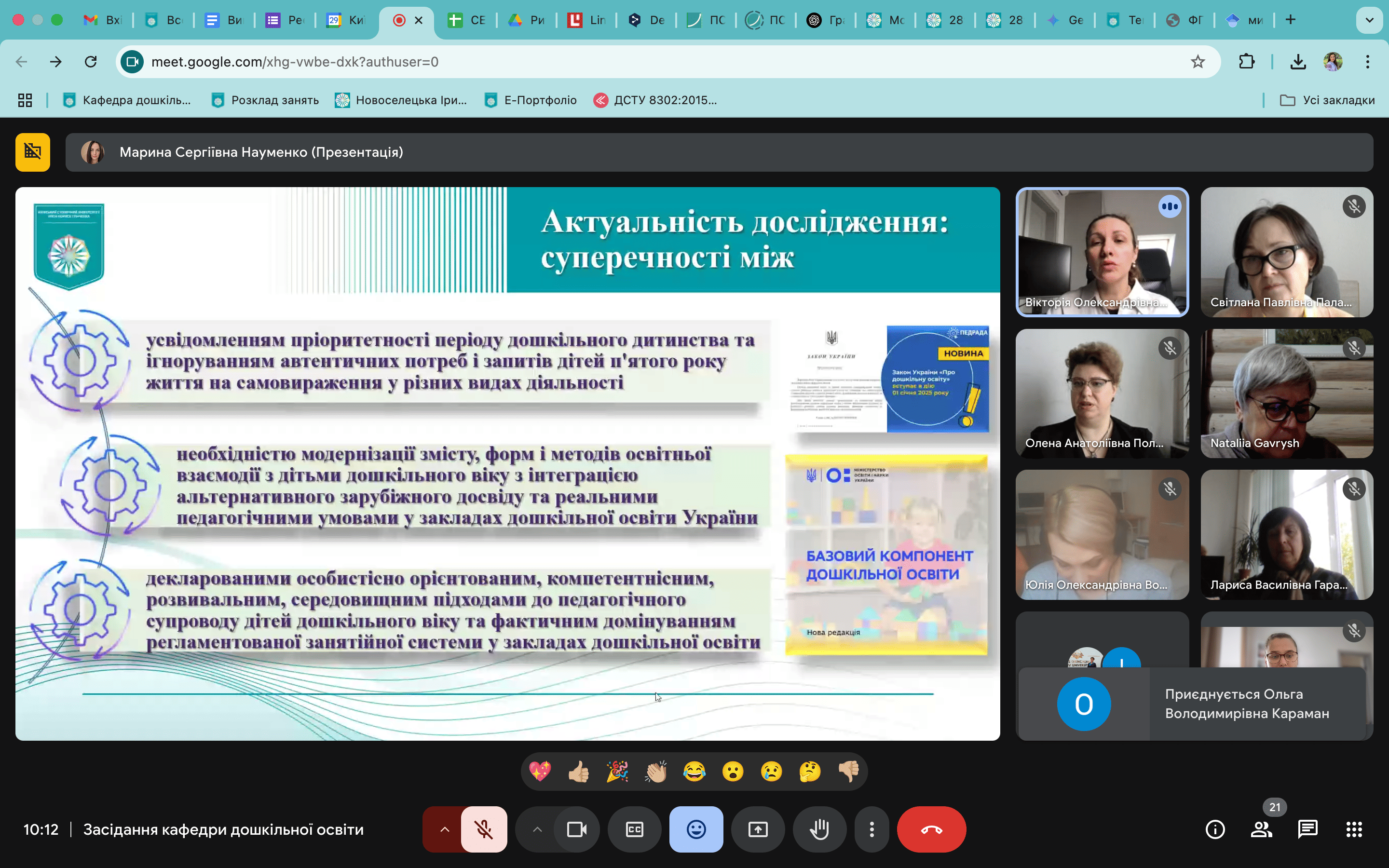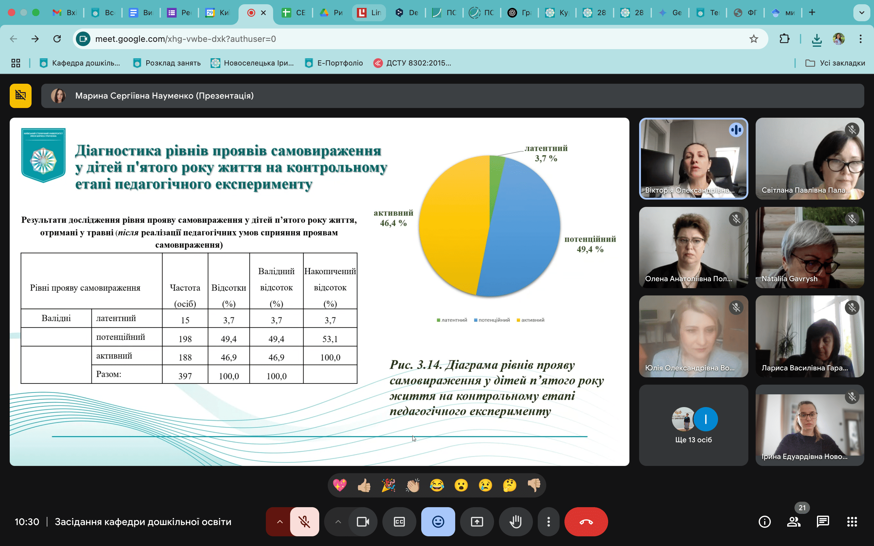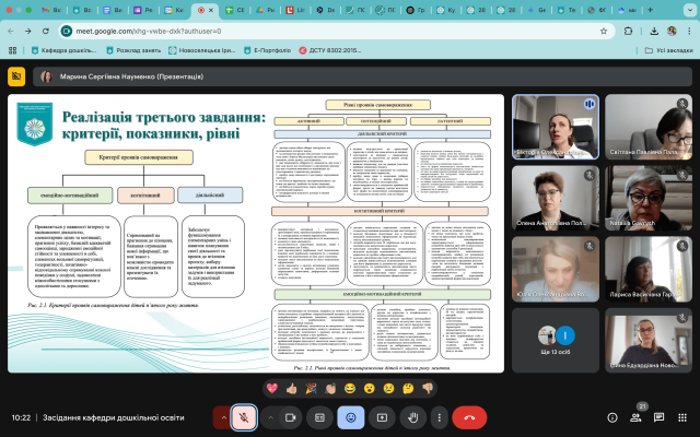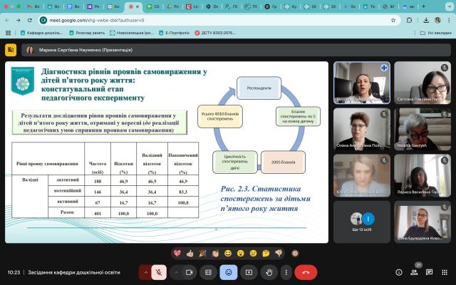29 квітня 2025 року відбулось розширене засідання кафедри дошкільної освіти Факультету педагогічної освіти. На порядку денному – публічна презентація наукових результатів дисертації В’юнник Вікторії Олександрівни на тему «Самовираження дітей п’ятого року життя в освітньому середовищі закладів дошкільної освіти», поданої на здобуття ступеня доктора філософії з галузі знань 01 Освіта/Педагогіка за спеціальністю 012 Дошкільна освіта, та її обговорення для надання висновку про наукову новизну, теоретичне та практичне значення результатів дисертації. Науковий керівник – Половіна О. А., завідувач кафедри дошкільної освіти Факультету педагогічної освіти Київського столичного університету імені Бориса Грінченка, кандидат педагогічних наук, доцент.