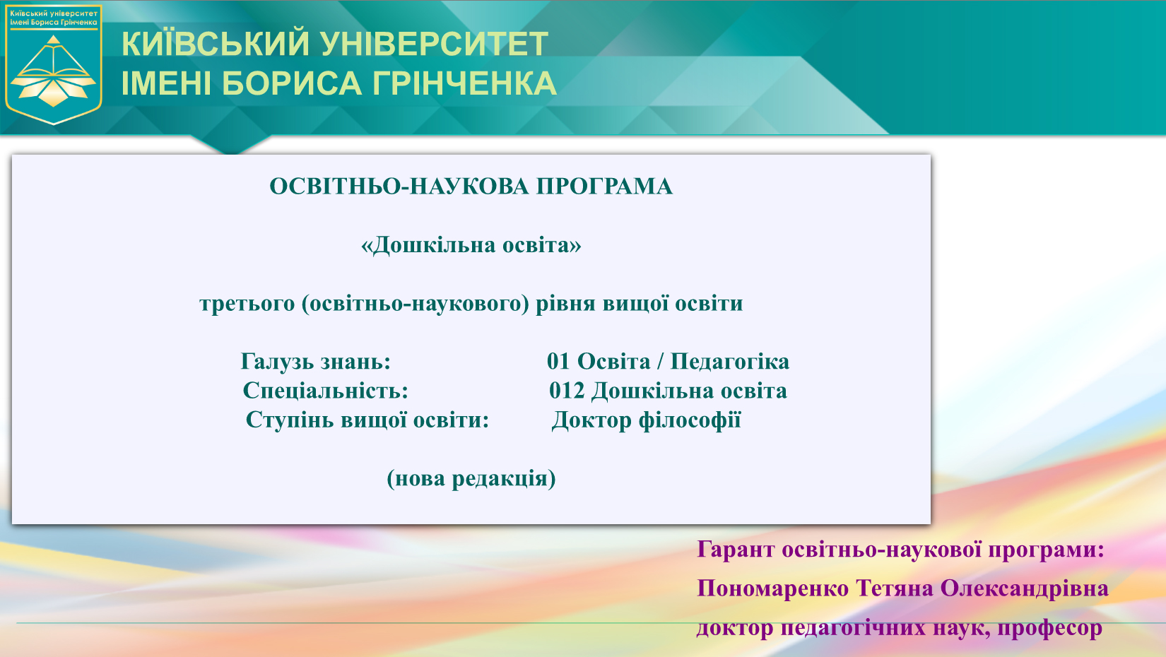 Гарант освітньо-наукової програми «Дошкільна освіта» третього (освітньо-наукового) рівня вищої освіти доктор педагогічних наук, професор, професор кафедри дошкільної освіти Пономаренко Тетяна Олександрівна (е-портфоліо)