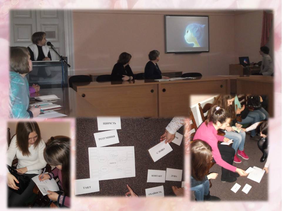 Розмова розгорталася на матеріалі надзвичайно цікавих відео-фрагментів і літературних текстів, що спонукали до обговорення. Крім колективного розмірковування, учасники виявили інтерес і до інших активних форм взаємодії, зокрема, складання схем, розігрування віртуальних діалогів, виконання психологічних вправ тощо.