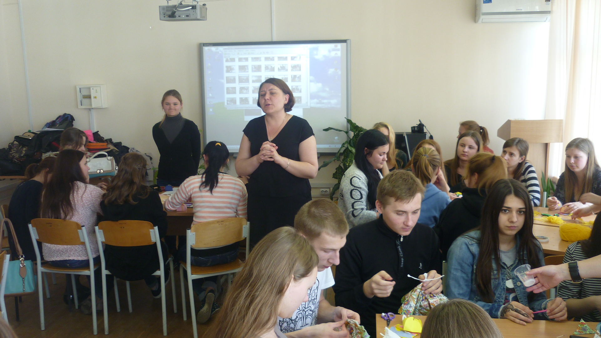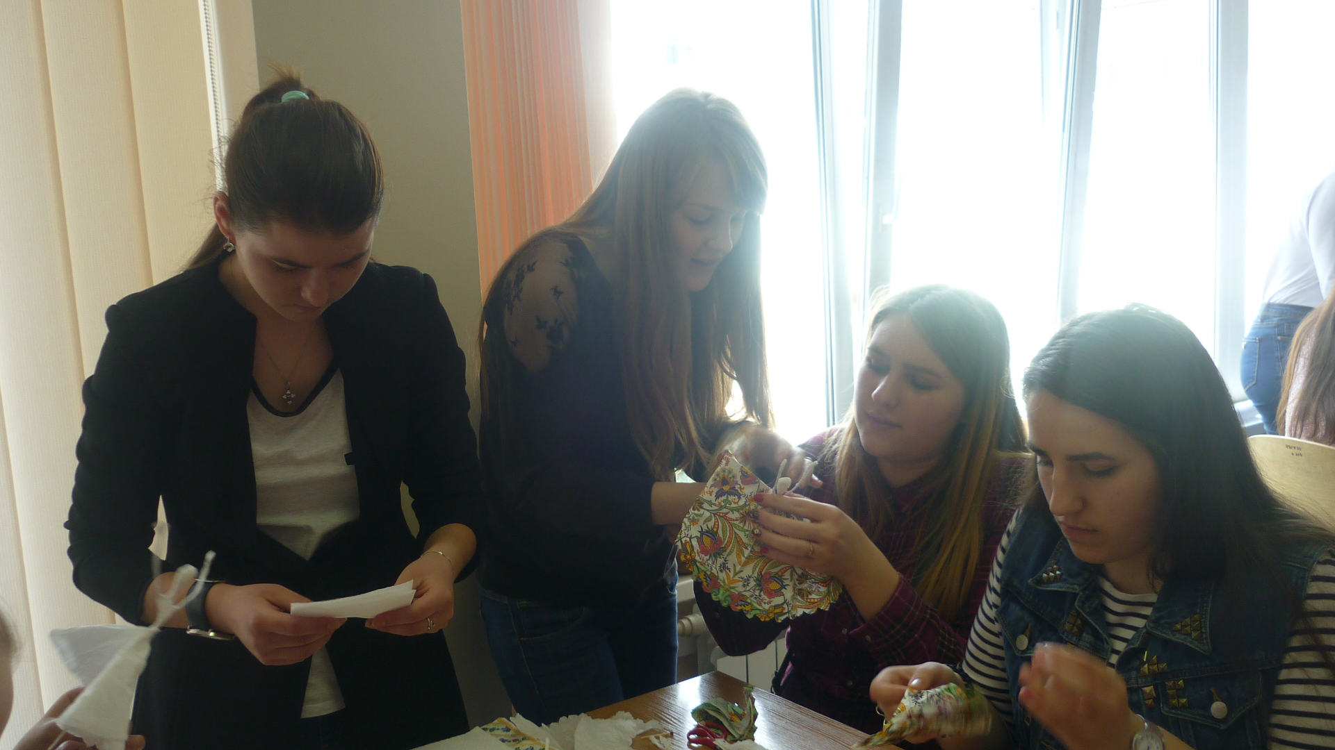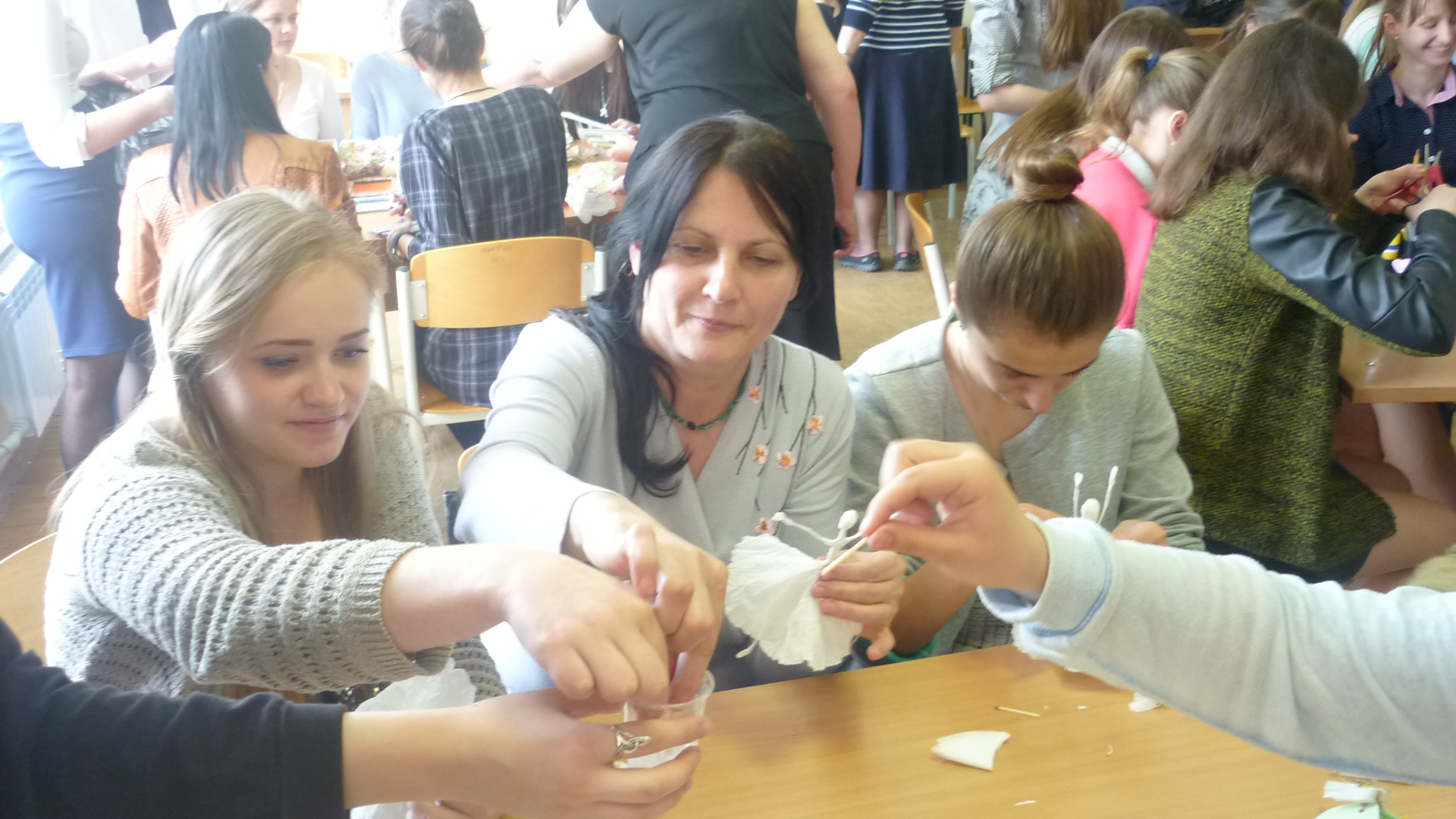 Форма організації відповідала заняттю комбінованого типу з використанням методу «Джигсо» (метод розвитку критичного мислення). На основі цього методу було організовано майстерню, в якій модераторами виступили студенти групи ДОб-2-15-4.0д. Дівчата організовували процес навчання в підгрупах, здійснювали попередню підготовку до роботи. Робота в групах, які змінювались кожні 7-8 хвилин, завершувалась виготовленням виробу кожним учасником.