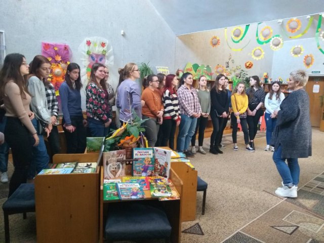 Для студентів була організована екскурсія відділами бібліотеки: відділ проектно-грантової діяльності та зв’язків із громадськістю, відділ обслуговування дітей дошкільного та молодшого шкільного віку, відділ рідкісних та цінних видань. Студенти ознайомились з особливостями роботи кожного відділу, правилами оформлення та видачі літератури, специфікою роботи в архіві, призначенням та різноманітністю фонду бібліотеки. Було представлено виставку з новинками пізнавальної літератури для дітей дошкільного віку, а також міні-презентація творчості сучасних українських письменників та поетів, що пишуть для дітей.