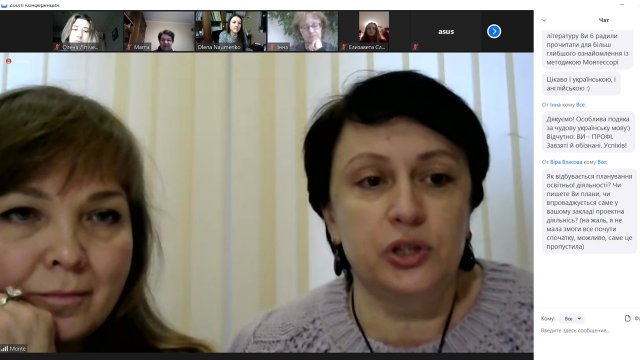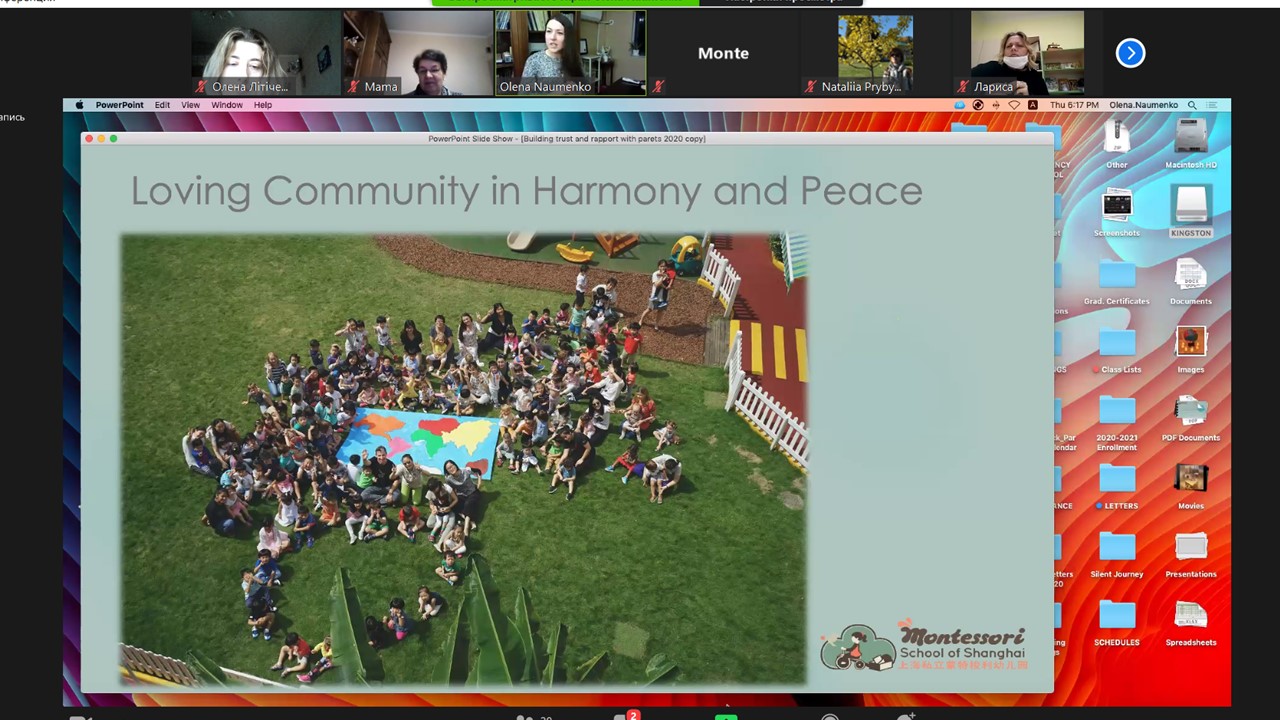 3 грудня 2020 р. відбулась онлайн-зустріч студентів-практикантів з директором школи М.Монтессорі в м. Шанхай (Китай) Науменко Оленою Вікторівною, яка ознайомила слухачів з дитячим садком – школою, в якій працює, та організацією освітнього процесу за системою М. Монтессорі. Зазначила особливості роботи закладу та надала інформацію про взаємодію між батьками, вихователями та дітьми в класах: Parent-Infant (діти віком від 6 до 18 місяців), Toddler Сommunity (діти віком від 1 до 3 років), Casa dei Bambini (діти віком від 3 до 6 років). Акцентувала увагу на важливості побудови довіри між усіма учасниками освітнього процесу. «Це робота йде від серця. Треба бути людиною, яка надихає»,- прозвучало з вуст Олени Вікторівни.