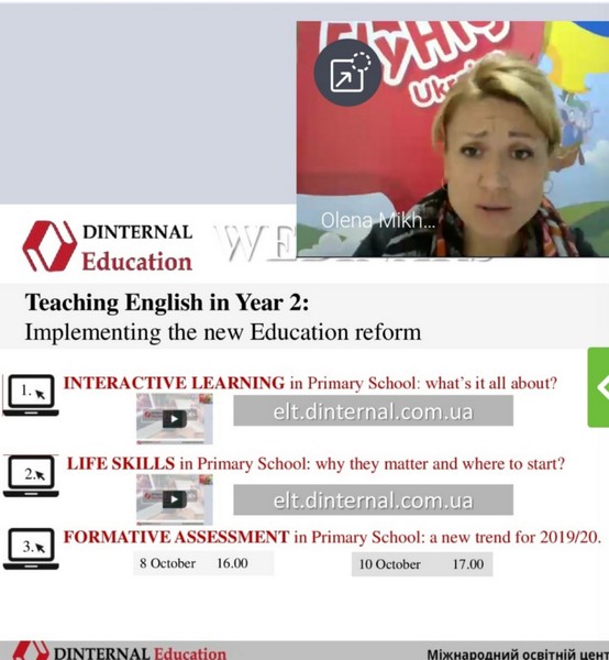 10 жовтня 2019 року студенти Педагогічного інституту взяли участь у методичному вебінарі «Teaching English: Implementing the new Education reform» у межах вивчення дисциплин «Професійне спілкування іноземною мовою». Учасники зустрічі – студенти спеціальності 012 «Дошкільна освіта» та 013 «Початкова освіта», другого (магістерського) рівня, ознайомились із особливостями організації навчання англійської мови дітей дошкільного та молодшого шкільного віку в умовах реформування національної системи освіти. У ході вебінару старший методист Міжнародного освітньо-методичного центру Dinternal Education Міходуй Олена представила зразки ефективних технологій навчання англійської мови.