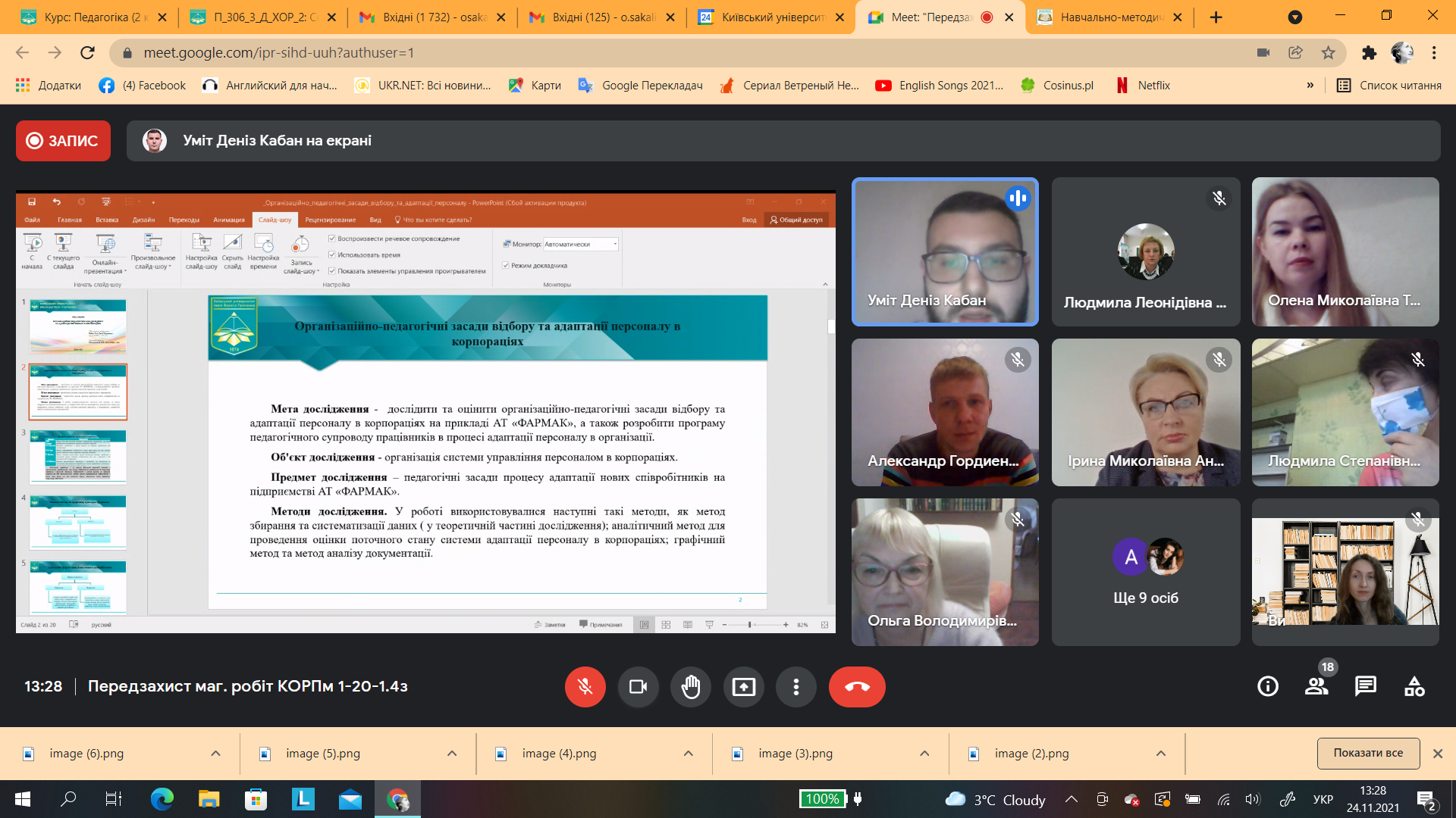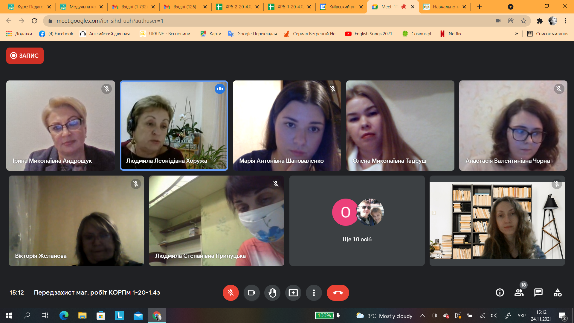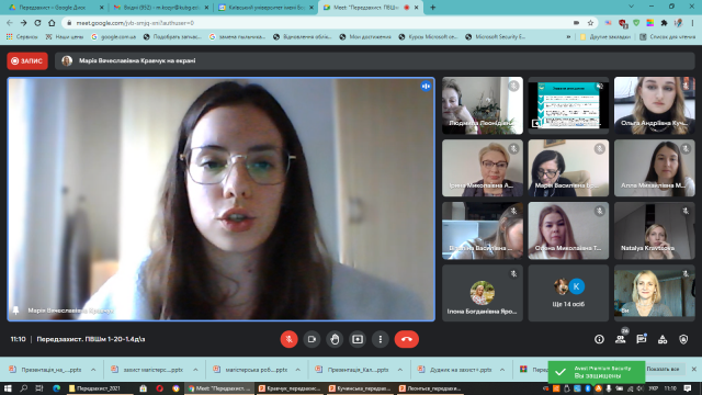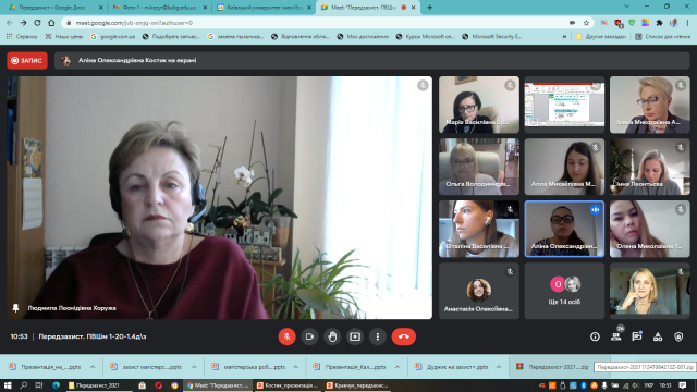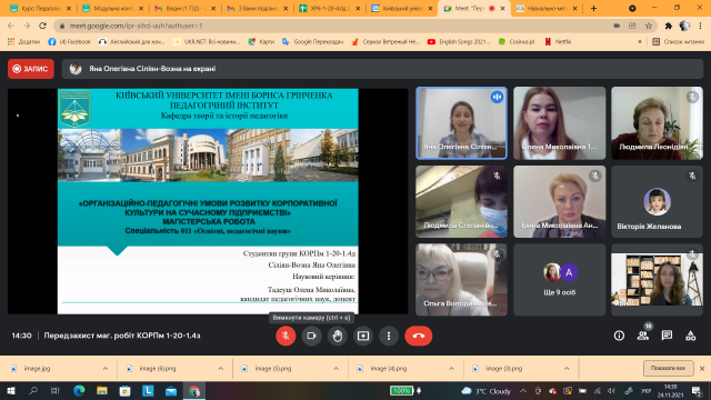 24 листопада 2021 року на кафедрі теорії та історії педагогіки Педагогічного інституту Київського університету імені Бориса Грінченка відбувся попередній захист магістерських кваліфікаційних робіт студентів освітньо-професійних програм 011.00.01 «Педагогіка вищої школи» та 011.00.03 «Корпоративна освіта та розвиток персоналу» денної і заочної форм навчання. Захід відбувся дистанційно, на платформі Googl Meet.