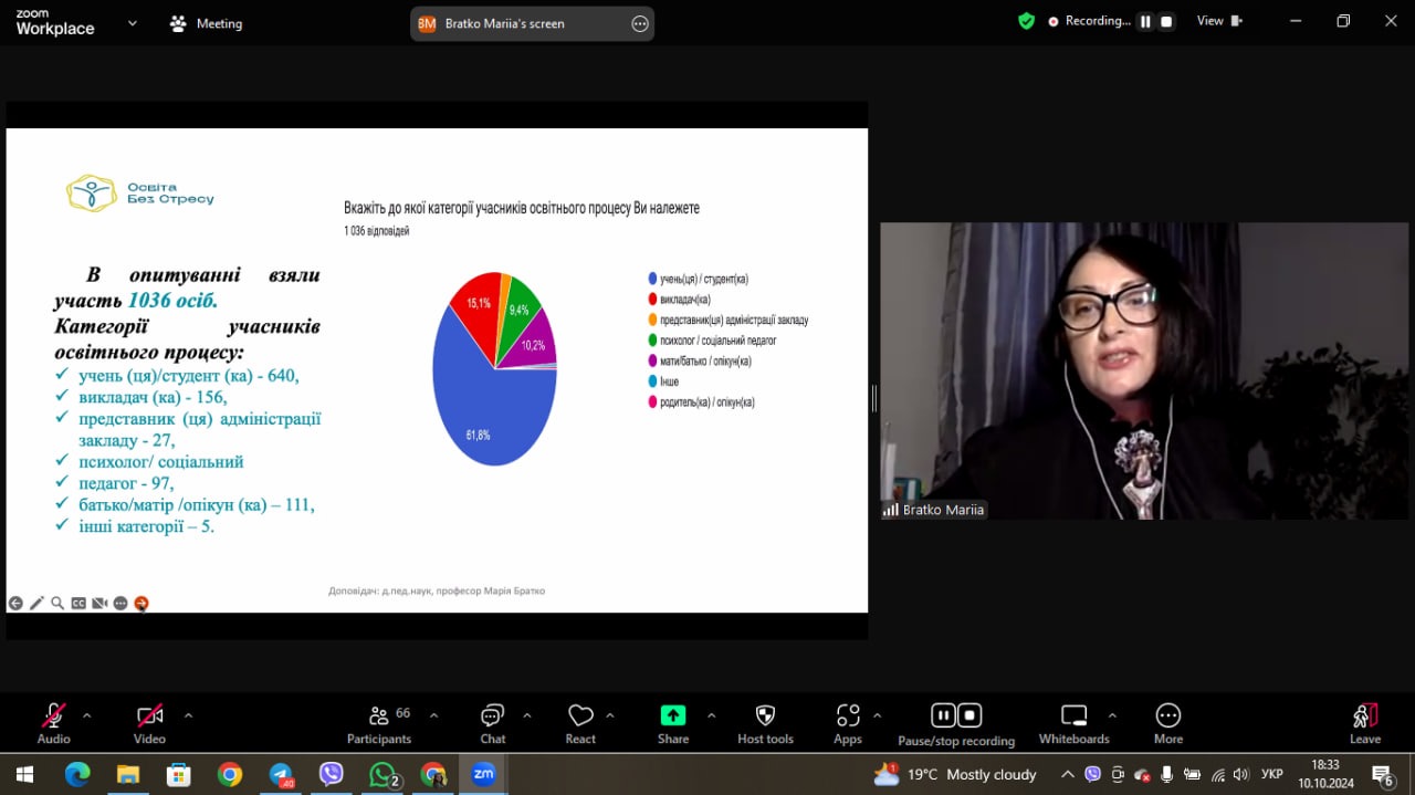 10 жовтня 2024 року докторка педагогічних наук, професорка, професорка кафедри освітології та психолого-педагогічних наук Факультету педагогічної освіти – Марія Братко долучилася до участі у вебінарі, присвяченому Всесвітньому Дню ментального здоров’я «Освіта без стресу: як американський досвід підтримки ментального здоров’я у навчальних закладах може стати корисним для України» як спікер та експертка у галузі освіти в Charity Fund "Act For Ukraine".