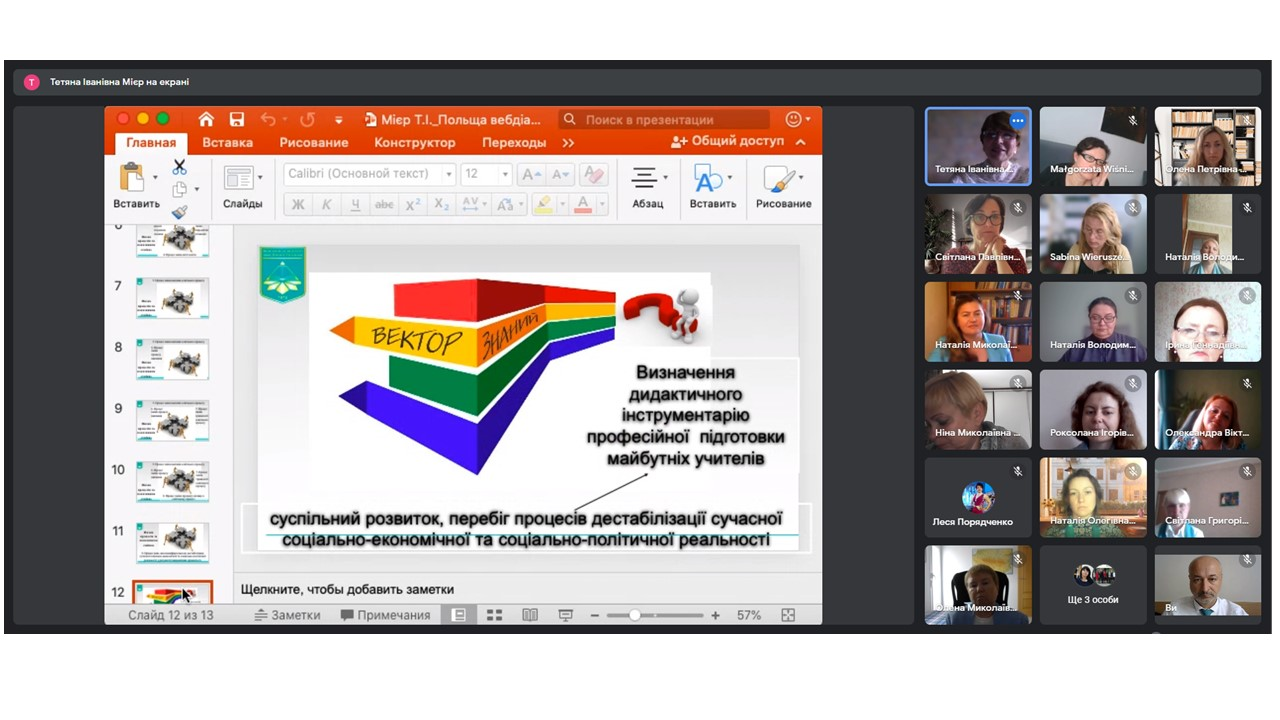 Науковий вебінар було присвячено українсько-польському дискурсу з актуальних питань професійної підготовки майбутніх учителів початкових класів у закладах вищої освіти. Основне коло проблематики дискурсу: сучасна освітня політика в галузі вищої освіти України та Польщі; розвиток персоналу в закладах вищої освіти: система підвищення кваліфікації, стажування, академічна мобільність в Україні та Польщі; сучасні тенденції професійної підготовки майбутніх учителів в Україні та Польщі; інформатизація та інноваційний компонент професійної підготовки майбутніх учителів в Україні та Польщі.