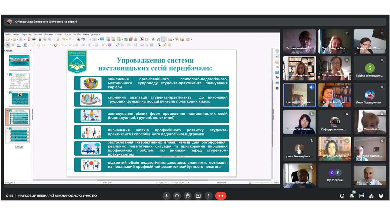 Під час наукового вебінару з доповідями виступили: Анна Клім-Клімашевська, директор Інституту педагогіки Природничо-гуманітарного університету в Сєдльцах, професор, доктор габілітований (Польща) (тема доповіді «Польська система вищої освіти»); Малгожата Вишневська, доктор наук, Інститут педагогіки Природничо-гуманітарного університету в Сєдльцах (Польща) (тема доповіді «Сучасна освітня політика в країнах Європи. Законодавчі та нормативні документи сучасної освітньої політики країн ЄС»); Сабіна Верушевська-Дурай, доктор наук, Інститут педагогіки Природничо-гуманітарного університету в Сєдльцах (Польща) (тема доповіді «Особливості організації навчального процесу на бакалавраті та в магістратурі»); Хелена Коновалюк-Нікітін, доктор наук, кафедра педагогіки Академiї Бяльска Прикладних Наук iм. Iвана Павла II (Польша) (тема доповіді «Виховання в світлі персоналізму Івана Павла ІІ»); Сергіуш Нікітін, доктор наук, Комплекс Шкiл Професiйного Навчання №2 в м. Бяла Пiдляска (Польша) (тема доповіді «Неперервність польської освіти»); Олена Ліннік, доктор педагогічних наук, професор кафедри початкової освіти Педагогічного інституту Київського Університету імені Бориса Грінченка (тема доповіді «Сучасна освітня політика в Україні як передумова вибудови змісту підготовки вчителя початкових класів»); Світлана Паламар, заступник директора з наукової роботи Педагогічного інституту Київського університету імені Бориса Грінченка, кандидат педагогічних наук, старший науковий співробітник (тема доповіді «Професійний розвиток персоналу в Педагогічному інституті Київського університету імені Бориса Грінченка»); Геннадій Бондаренко, завідувач кафедри початкової освіти Педагогічного інституту Київського університету імені Бориса Грінченка, кандидат педагогічних наук, доцент (тема доповіді «Інновації в професійній підготовці вчителя початкових класів: досвід Педагогічного інституту Київського університету імені Бориса Грінченка»); Наталія Кошарна, завідувач кафедри іноземних мов і методик їх навчання Педагогічного інституту Київського університету імені Бориса Грінченка, кандидат педагогічних наук, доцент (тема доповіді «Іншомовна професійна підготовка вчителя початкових класів в умовах HyFlex навчання (на прикладі Педагогічного інституту Київського університету імені Бориса Грінченка)»); Тетяна Мієр, доктор педагогічних наук, професор кафедри початкової освіти Педагогічного інституту Київського університету імені Бориса Грінченка (тема доповіді «Акценти у визначенні дидактичного інструментарію професійної підготовки майбутніх учителів в умовах як суспільного розвитку, так і дестабілізації сучасної соціально-економічної та соціально-політичної реальності»); Наталія Вишнівська, кандидат педагогічних наук, старший викладач кафедри початкової освіти Педагогічного інституту Київського університету імені Бориса Грінченка (тема доповіді «Ротаційна модель виробничої практики як інноваційний компонент у професійній підготовці вчителя початкових класів»); Людмила Нежива, доктор педагогічних наук, професор кафедри початкової освіти Педагогічного інституту Київського університету імені Бориса Грінченка (тема доповіді «Віртуалізація літературної освіти майбутніх учителів початкових класів»); Олександра Шкуренко, 