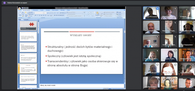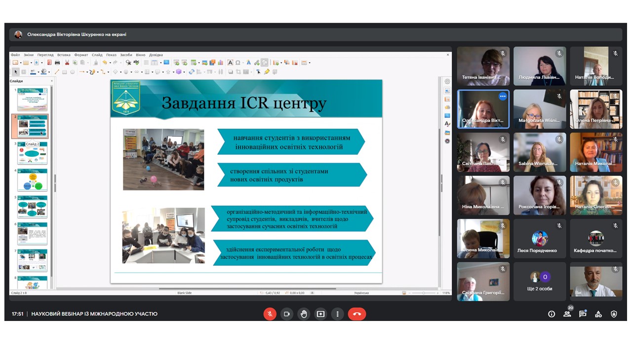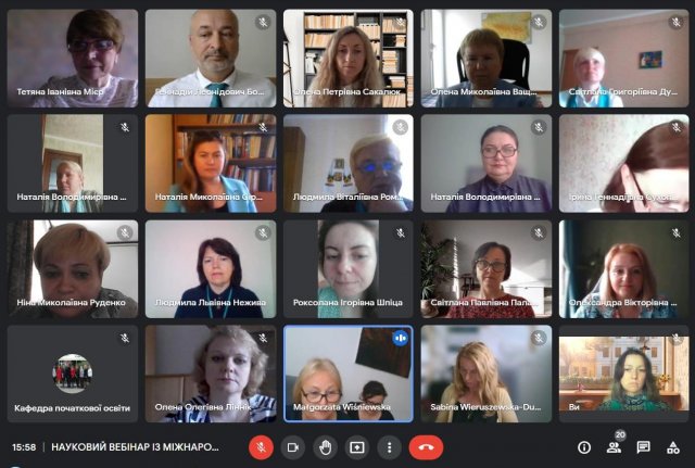 Науковий вебінар було проведено в системі онлайн-вебінарів і веб-конференцій Google Meet. Програма заходу тут. З вітальними словами до учасників наукового вебінару звернулися Ольга Котенко, директор Педагогічного інституту Київського університету імені Бориса Грінченка, кандидат педагогічних наук, доцент; Анна Клім-Клімашевська, директор Інституту педагогіки Природничо-гуманітарного університету в Сєдльцах, професор, доктор габілітований (Польща); доктор наук Хелена Коновалюк-Нікітін, кафедра педагогіки Академiї Бяльска Прикладних Наук iмені Iвана Павла II в Бялой Пiдляске, (Польща); доктор наук Нікітін Сергіуш, Комплекс Шкiл Професiйного Навчання №2 в м. Бяла Пiдляска (Польша)
