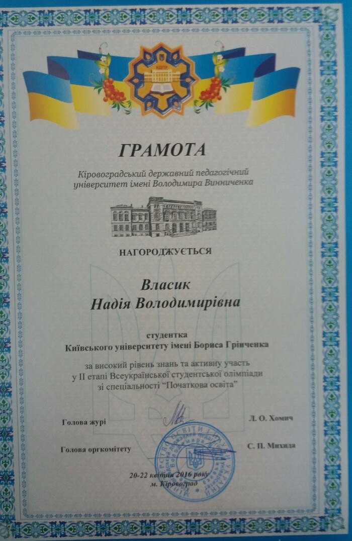 З 20 по 22 квітня 2016 року студентки-магістрантки спеціальності «Початкова освіта» Гнед І.В. та Власик Н.В. взяли участь у Всеукраїнській студентській олімпіаді зі спеціальності «Початкова освіта» у Кіровоградському державному педагогічному університеті імені Володимира Винниченка.