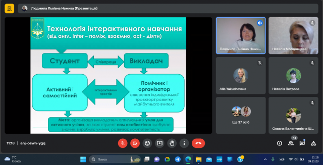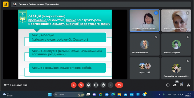 На онлайн-лекції обговорювалися питання застосування навчальних технологій у процесі професійної підготовки вчителів початкових класів (мовно-літературна галузь), зокрема контекстного, інтегрованого, інтерактивного, проблемного навчання студентів. А також організації проєктної діяльності майбутніх педагогів, використання ІК-технологій на заняттях з фахових методик у ЗВО.