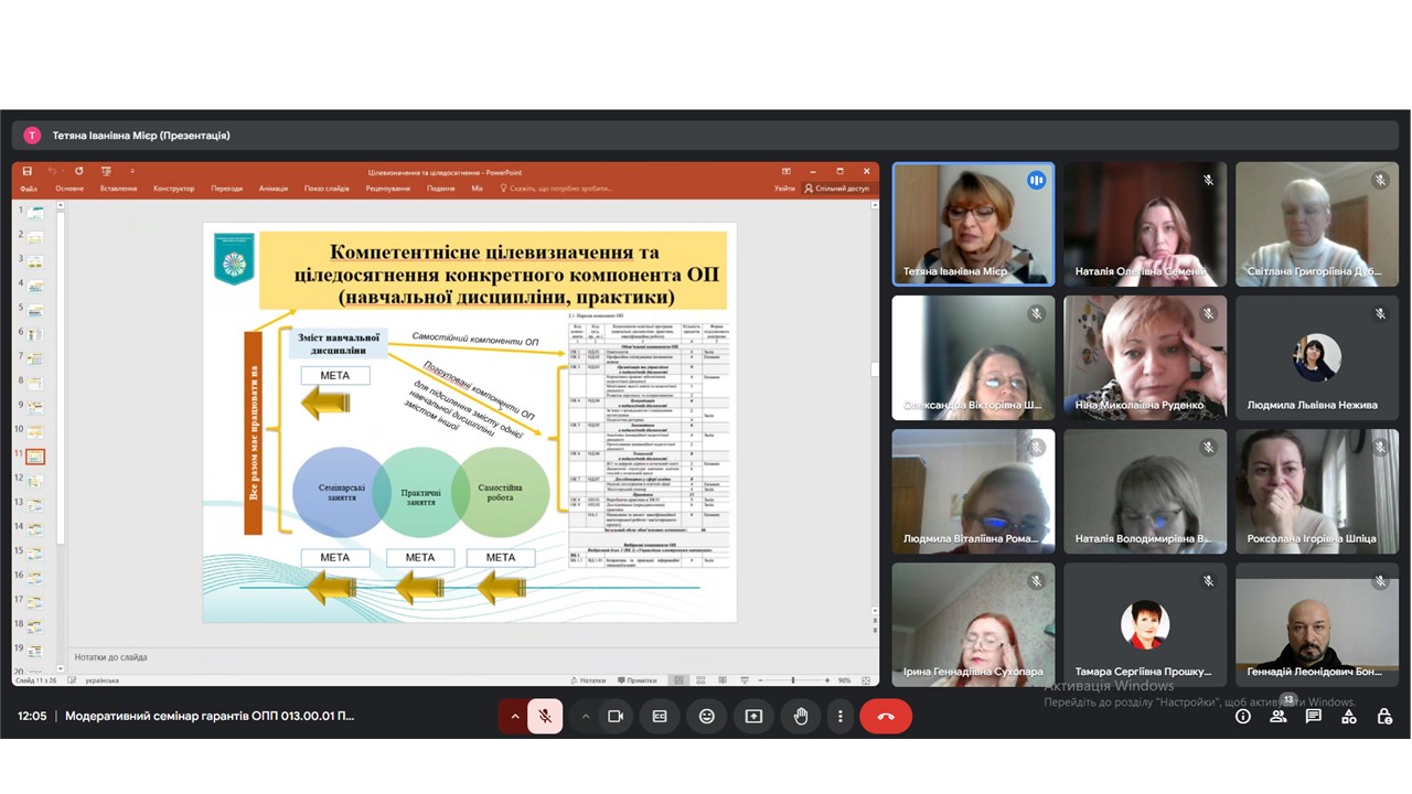 13 січня 2025 року для професорсько-викладацького складу кафедри початкової освіти Факультету педагогічної освіти Київського столичного університету імені Бориса Грінченка з метою обговорення результатів практичної реалізації нових редакцій ОПП в першому півріччі 2024-2025 н.р. та визначення напрямів подальшого удосконалення змісту робочих програм навчальних дисциплін, відповідно до яких здійснюється навчання на першому (бакалаврському) та другому (магістерському) рівнях здобуття вищої освіти за спеціальністю 013 Початкова освіта, було проведено модеративний семінар гарантів «Практична реалізація нових редакцій ОПП 013.00.01 Початкова освіта: діалоги в контексті компетентнісно орієнтованого цілевизначення та ціледосягнення».