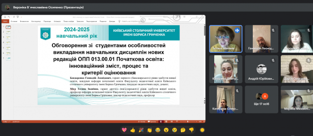 12 березня 2025 року здобувачів другого (магістерського) рівня вищої освіти денної та заочної форм навчання було запрошено на вебсемінар «Обговорення зі студентами особливостей викладання навчальних дисциплін нових редакцій ОПП 013.00.01 Початкова освіта: інноваційний зміст, процес та критерії оцінювання».