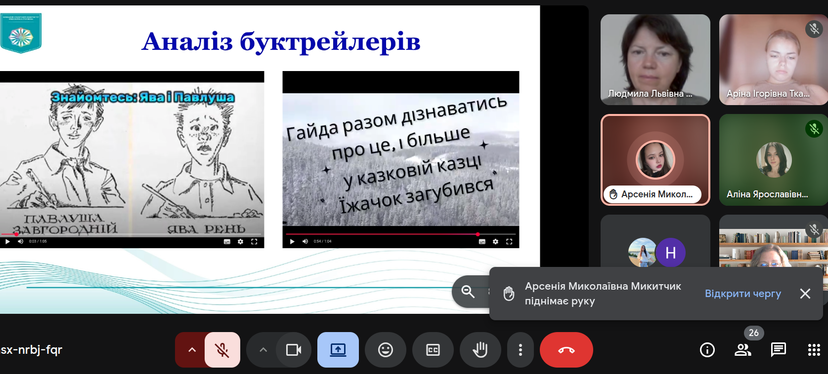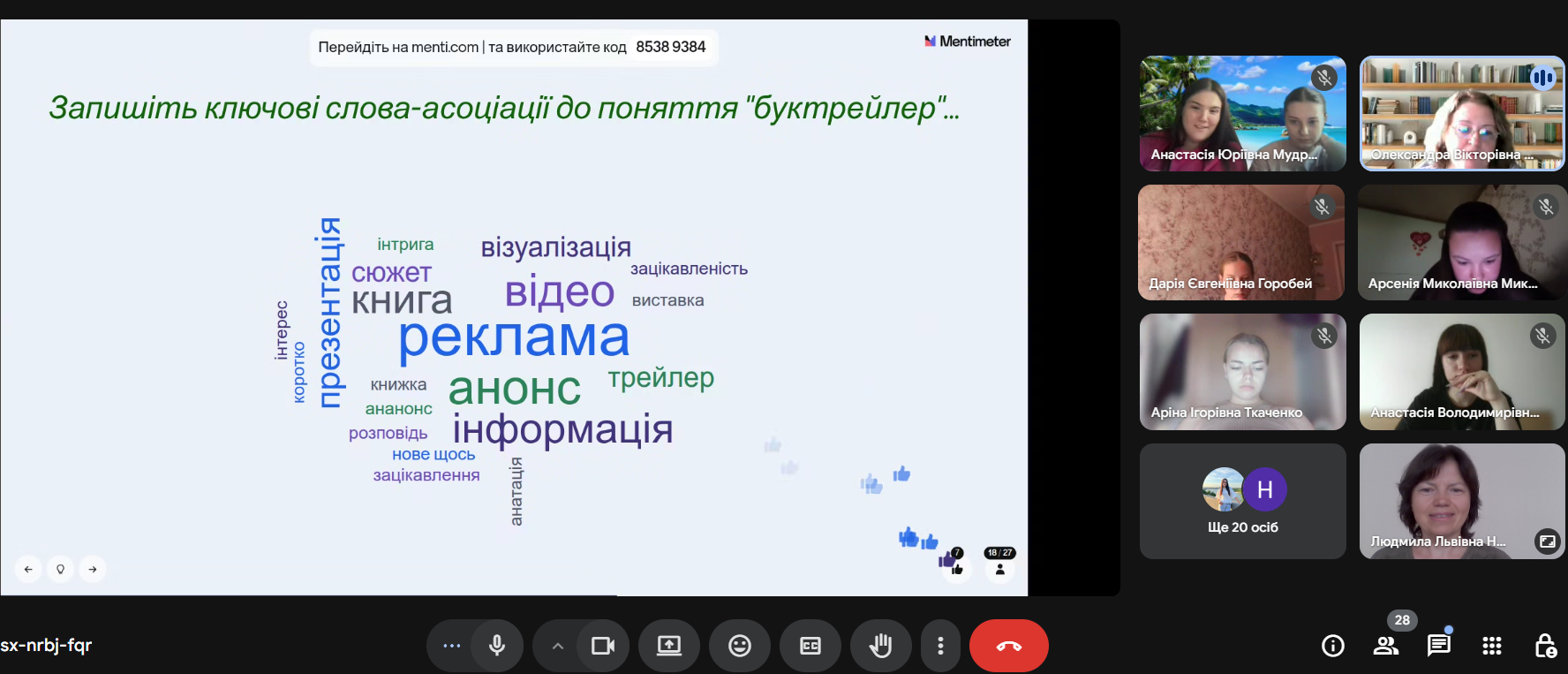 Засідання Наставницької студії НУШ було спрямовано на розвиток у студентів предметно-методичної та інформаційно-цифрової професійних компетентностей, які сприятимуть організації навчальної діяльності й розвитку молодших школярів. Майбутні педагоги навчились ефективно застосовувати рекламні буктрейлери в майбутній професійній діяльності з метою розвитку читацьких інтересів та самостійної читацької діяльності учнів початкових класів НУШ.